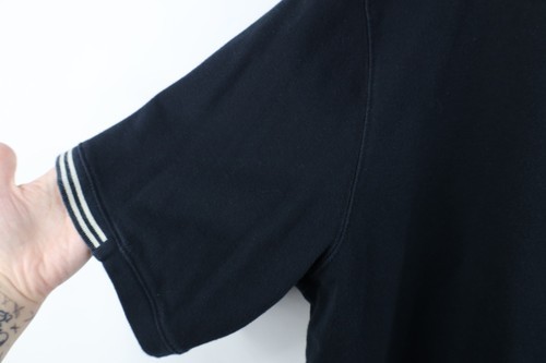 Blemishes shoulders, back top. Logo distressed left arm. Arms stretched. Collar, arms discolored. Dark spots, pilling. Color faded