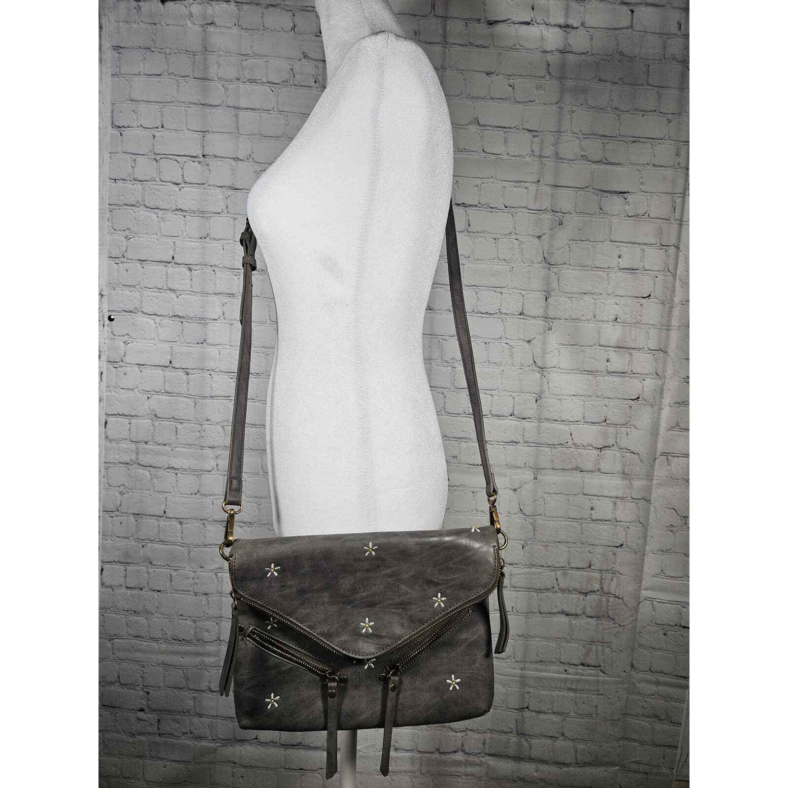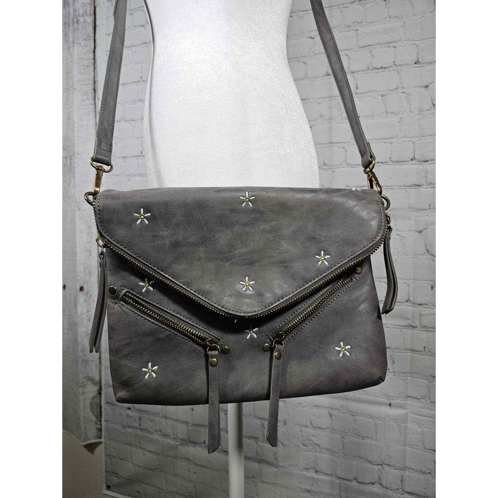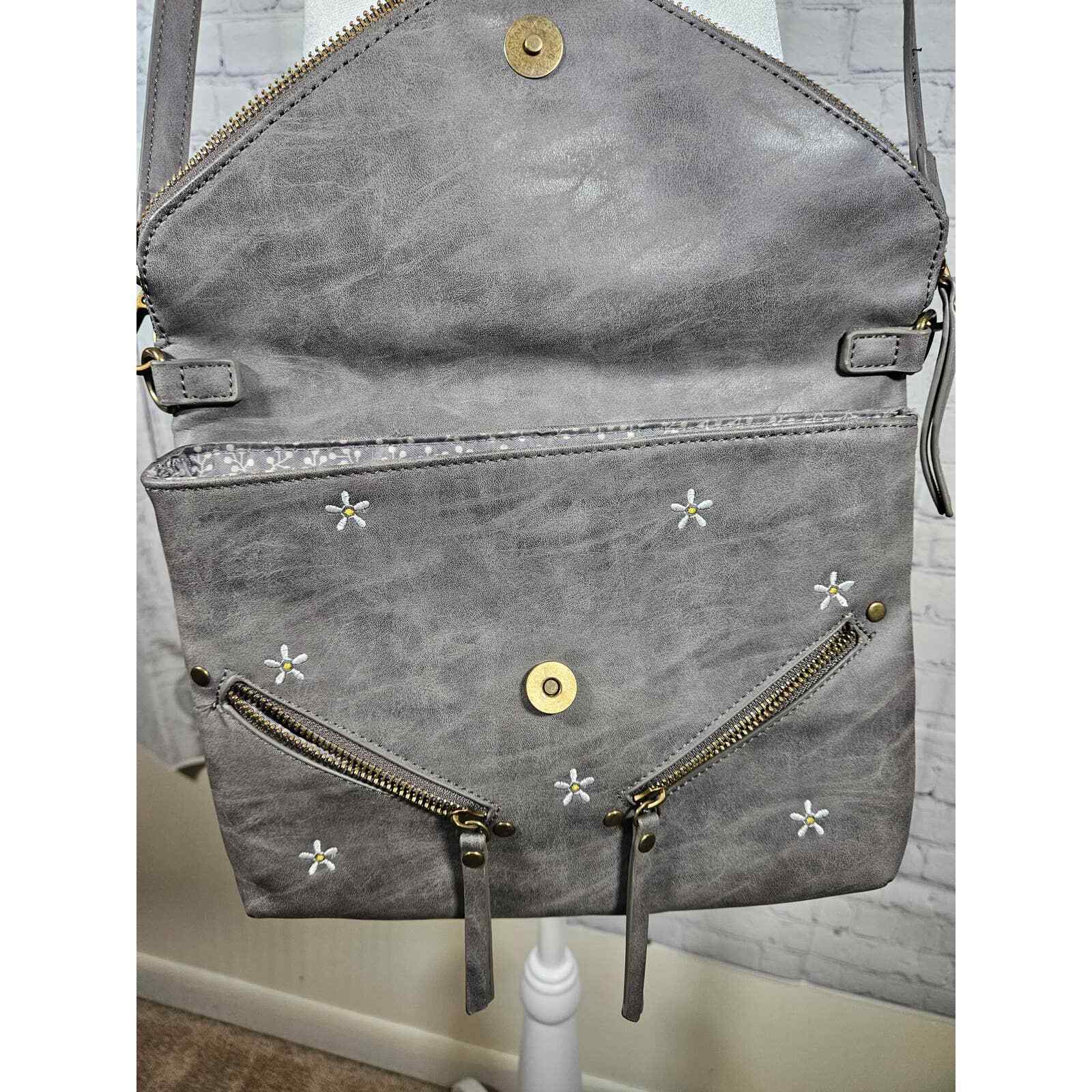 Womens Crossbody Faux Leather Bag Gray Daisies Envelope Style Double Zipper