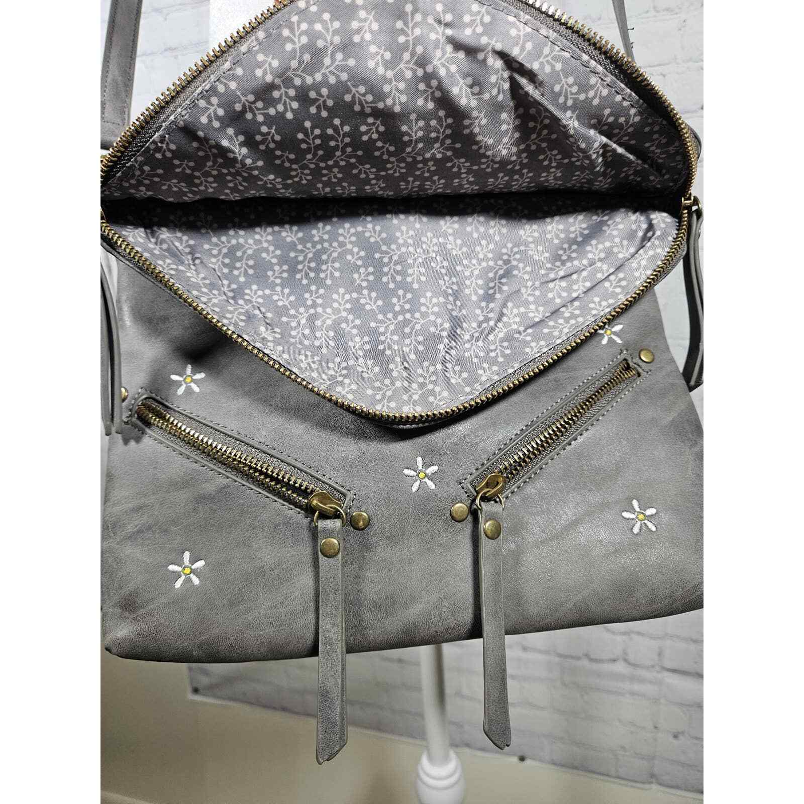 Women's Crossbody Faux Leather Bag Gray Daisies Envelope Style Double Zipper