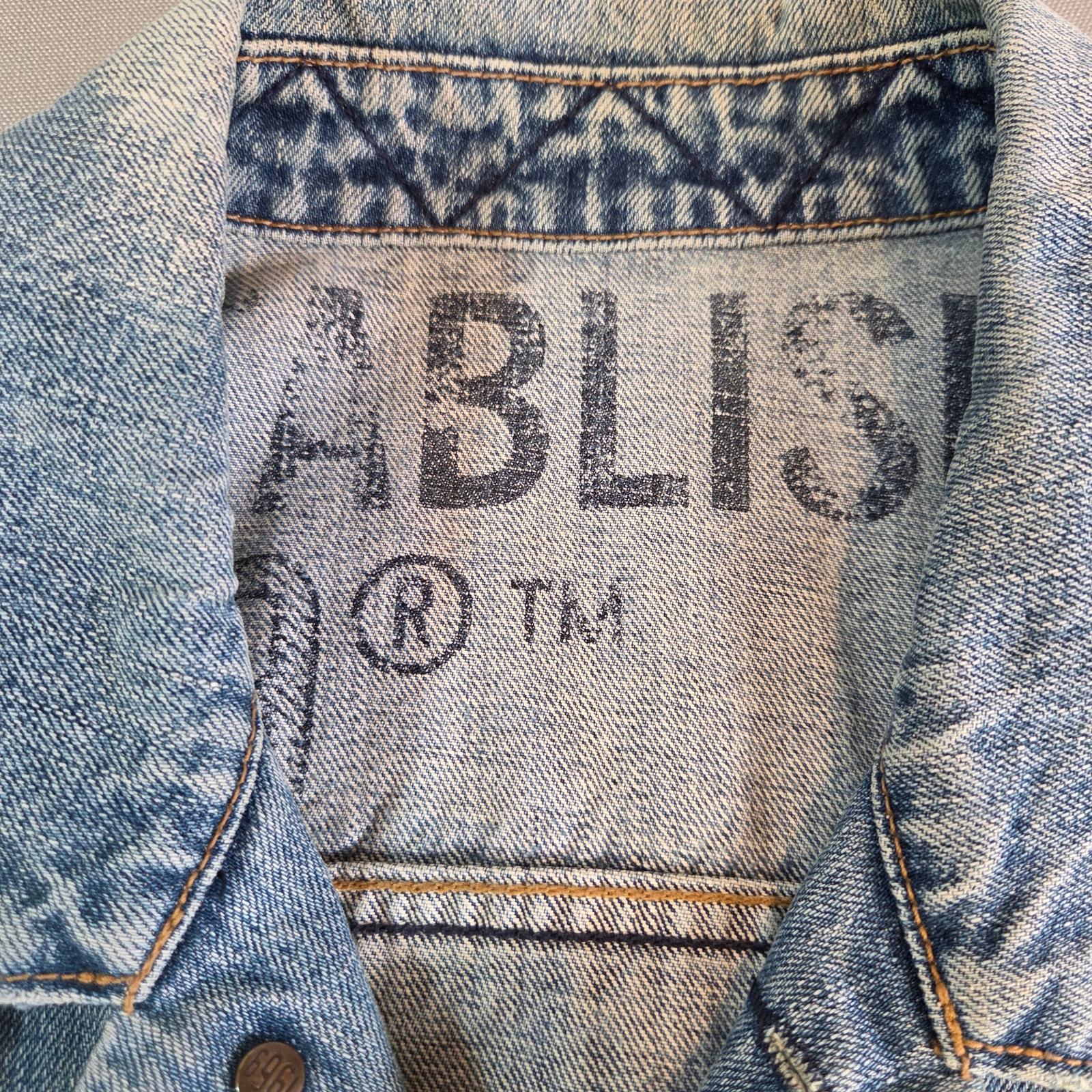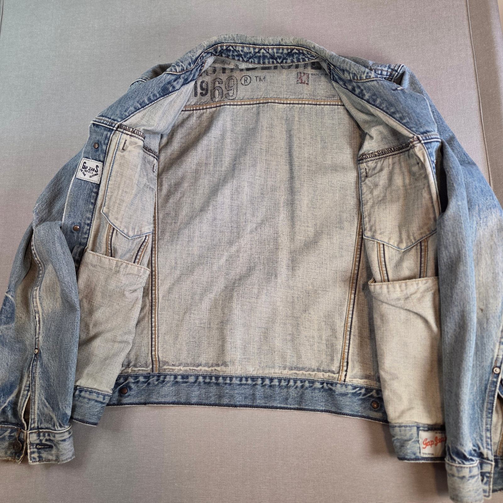 This Gap 1969 denim trucker jacket comes from the Fall 2006 release, crafted from 100% cotton in a medium tint wash. The piece features classic styling with button closure, chest flap pockets, and side welt pockets. The original size tag is missing, but measurements suggest a men?s medium to large fit ? please see measurements for accuracy. Jacket shows signs of wear with light marks and fraying at the cuffs, giving it a naturally distressed look.