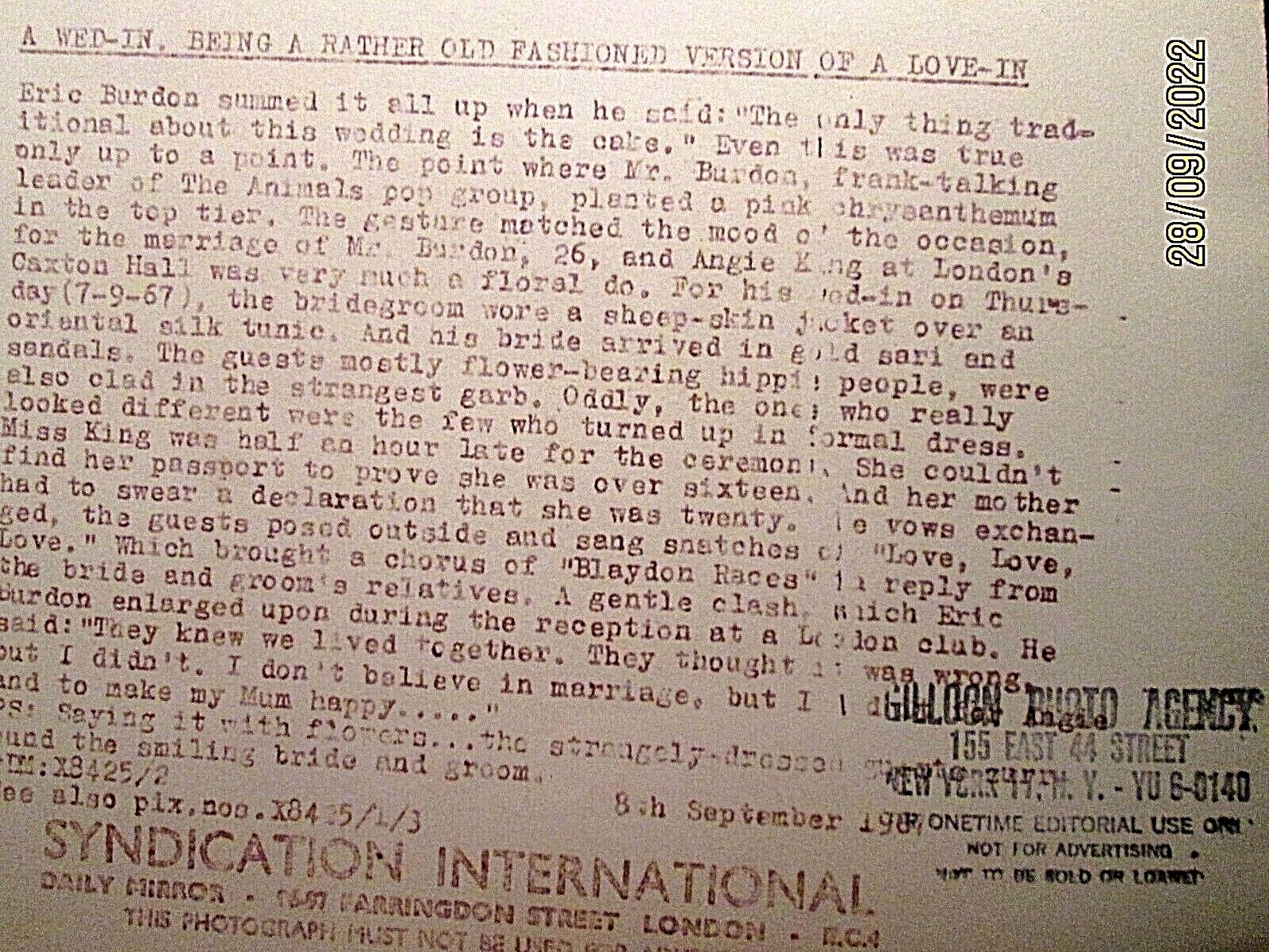 ERIC BURTON : (RARE VINTAGE BRITISH PRESS PHOTO) WEDDING OF ERIC BURTON