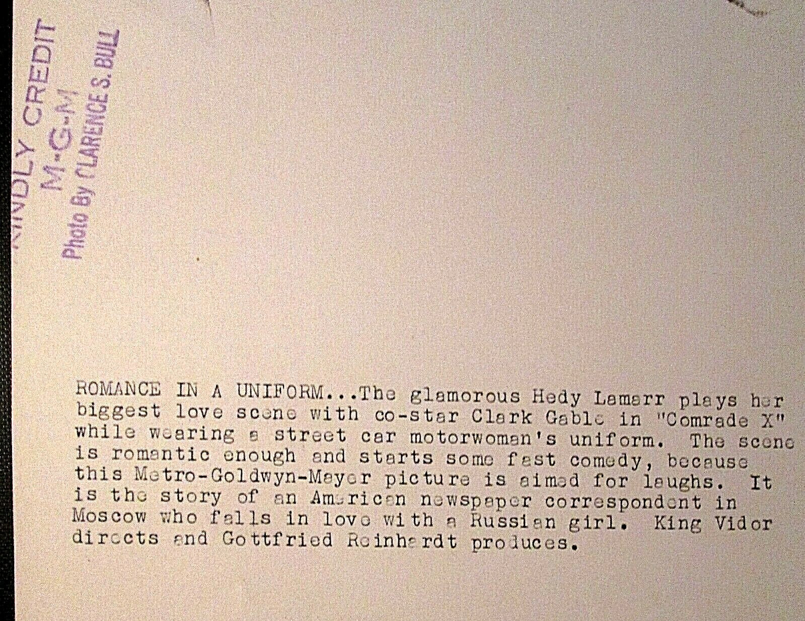 CLARK GABLE HEDY LAMARR (COMRADE X) ORIG, 1940 RARE CLARENCE BULL PHOTO (NOTE: CLARENCE BULL MGM STAMP ON BACK OF PHOTO WITH PAPER SNIPE INFO
