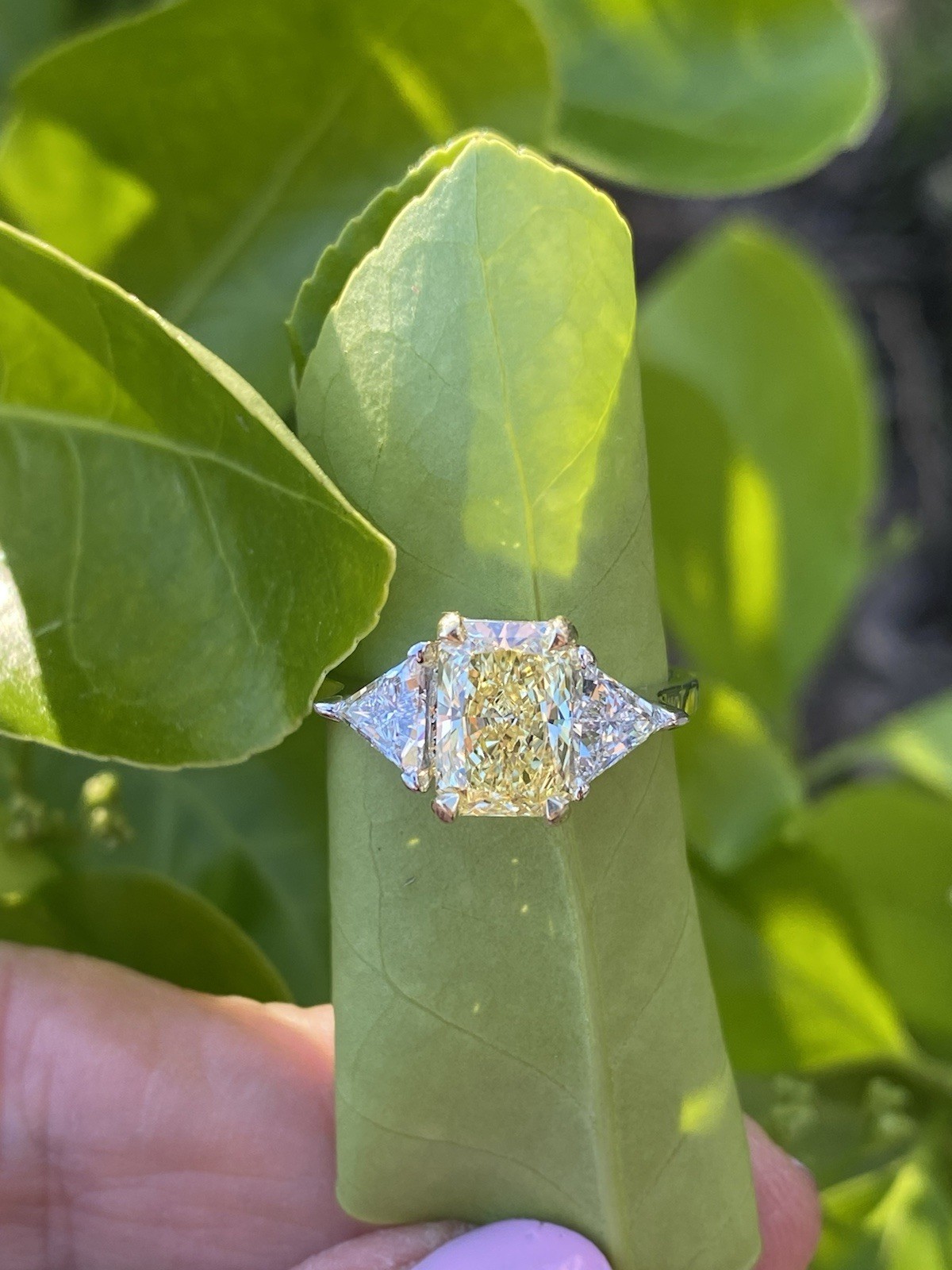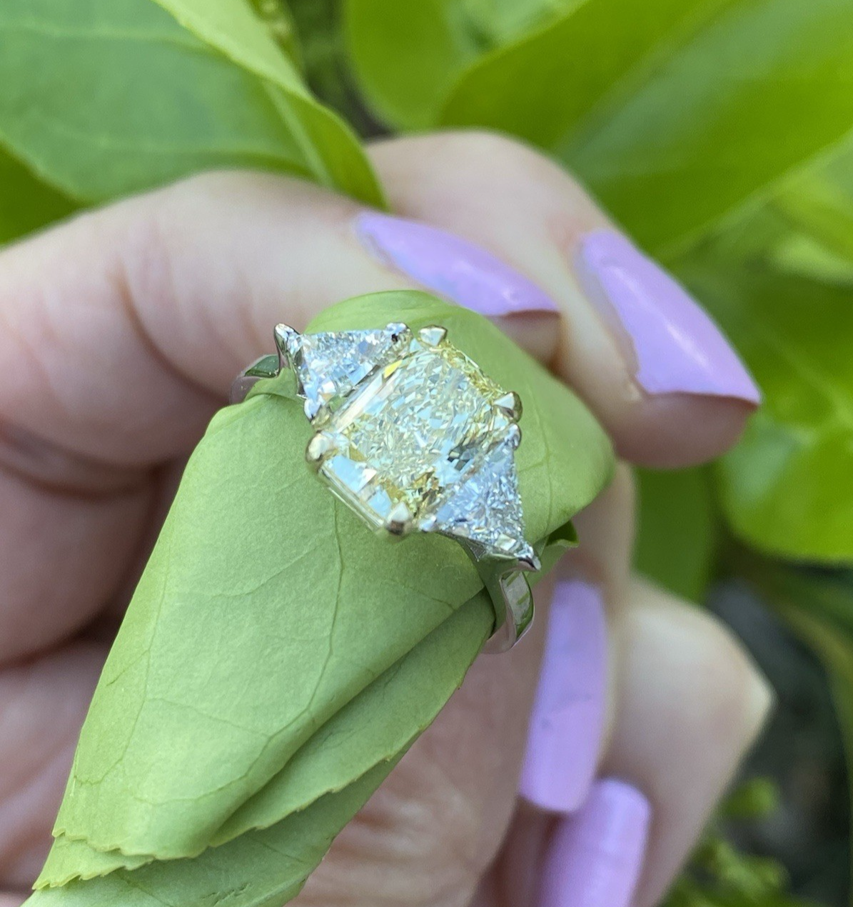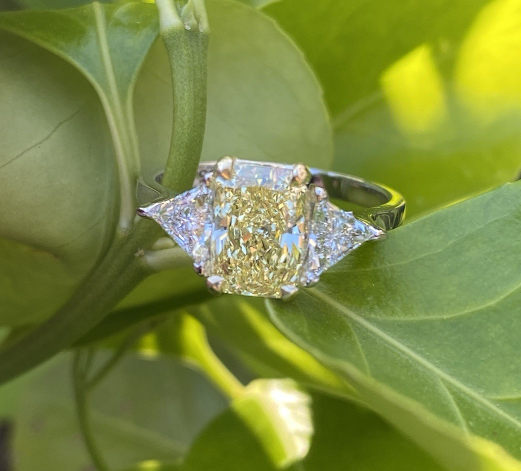 3 Stein 4.29Ctw Kissen Intense Gelb Igi Lab Grown Diamant Verlobungsring 18K