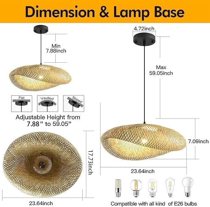 Light bulb requirements: This bamboo chandelier features 59.05-inch adjustable wires; uses up to 60W of American standard E26 lamp coordinates; is compatible with a variety of E26 bulbs; incandescent, energy-saving, halogen (excluding bulbs)