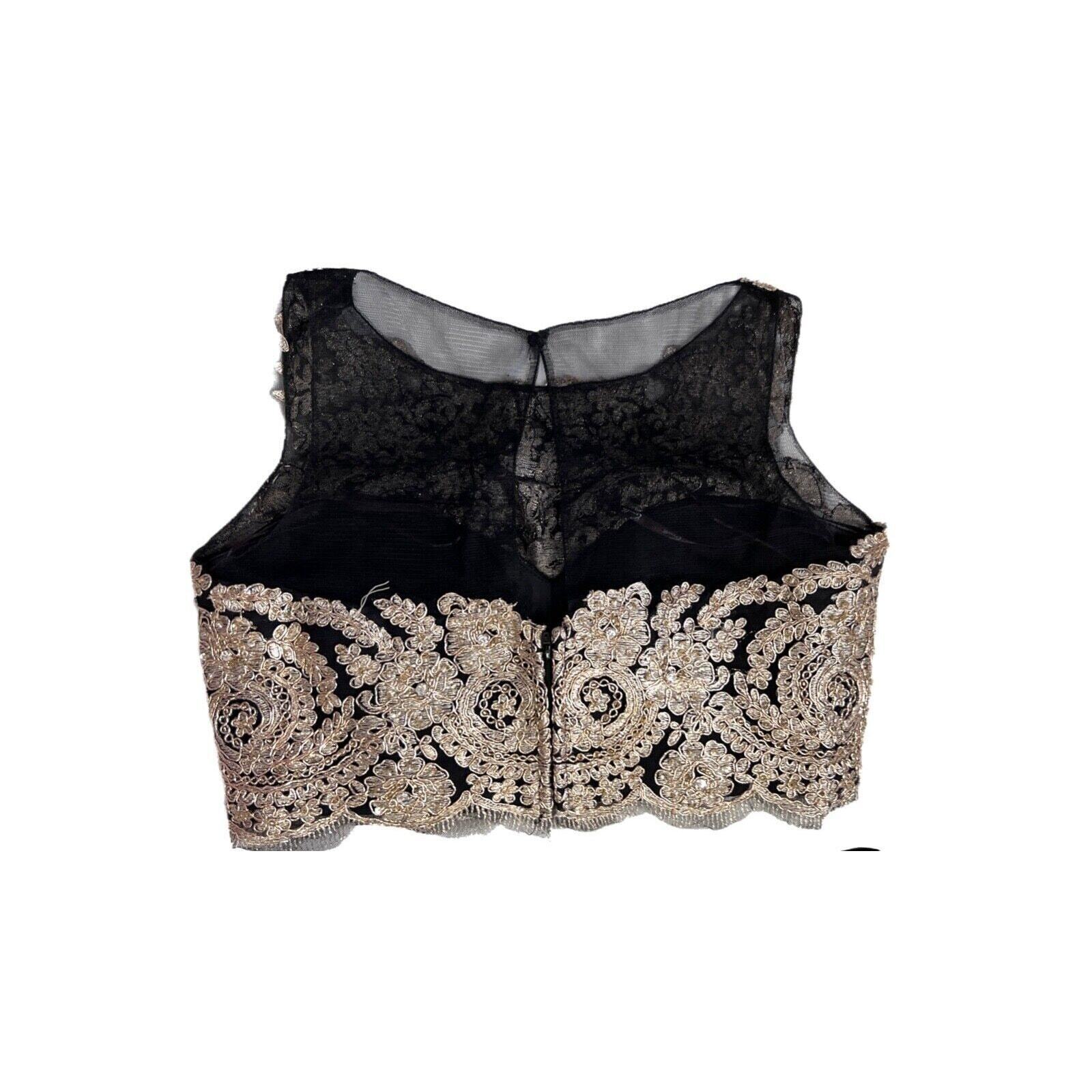 STUNNING Camille La Vie Black Lace Gold Lace Beaded Embroidered 2 Pc Dress Sz 6 - the top is a possibly midriff baring crop top, the skirt with a fitted to waist and hips and then sheer black tulle is very full.