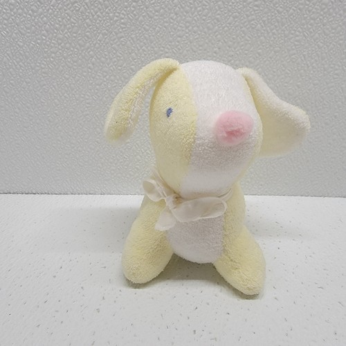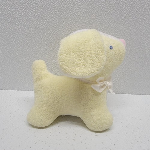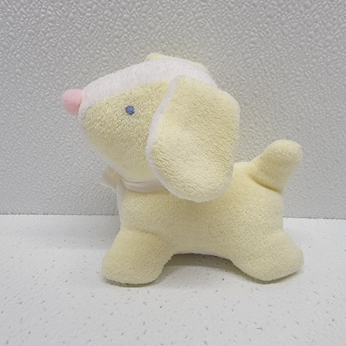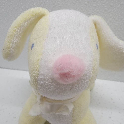 Vintage Yellow White Soft Terrycloth Baby Dog Plush Rattle Pink Nose Blue Eyes. Tag has been cut off, so not sure the brand. Images show actual plush that will ship.