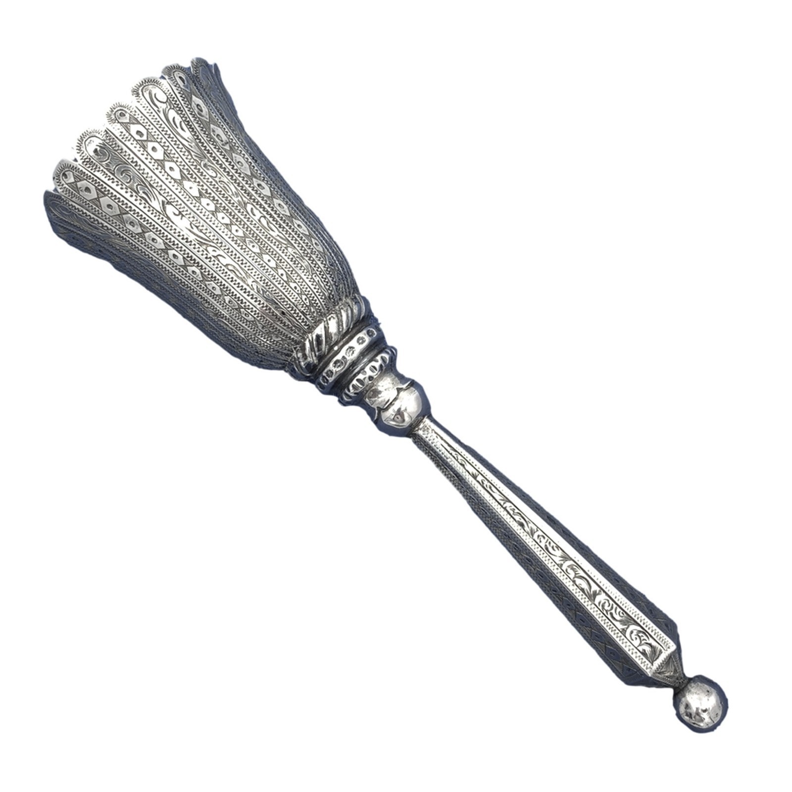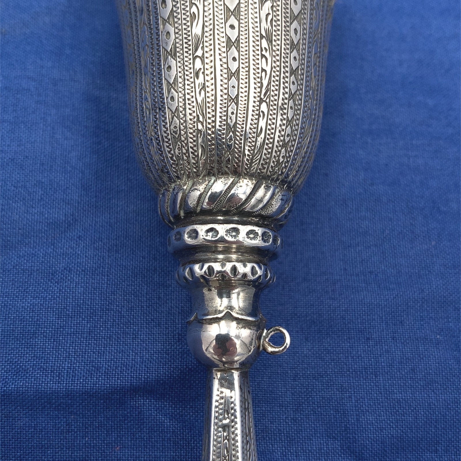 European silver tussie mussie. The tussie is hand engraved with scrollwork and geometric design. The bell shaped cup has a scalloped rim and gilt interior. It measures 6 3/8" long and 1 7/8" diameter of the cup. Good condition with some of the scalloped petals are bent. The ball shape at the bottom of the handle is dented. There is a faint hallmark that I was unable to determine. Terrific piece!