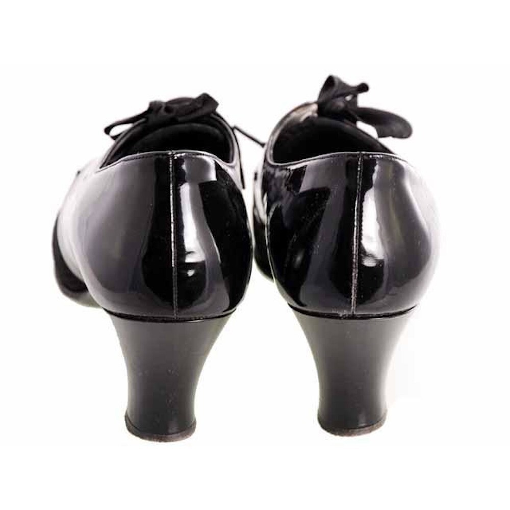 Lovely and wearable, this pair of womens vintage shoes has it all- shiny black patent leather, interesting mesh uppers, oxford styling with original laces, and a pretty curved heel.