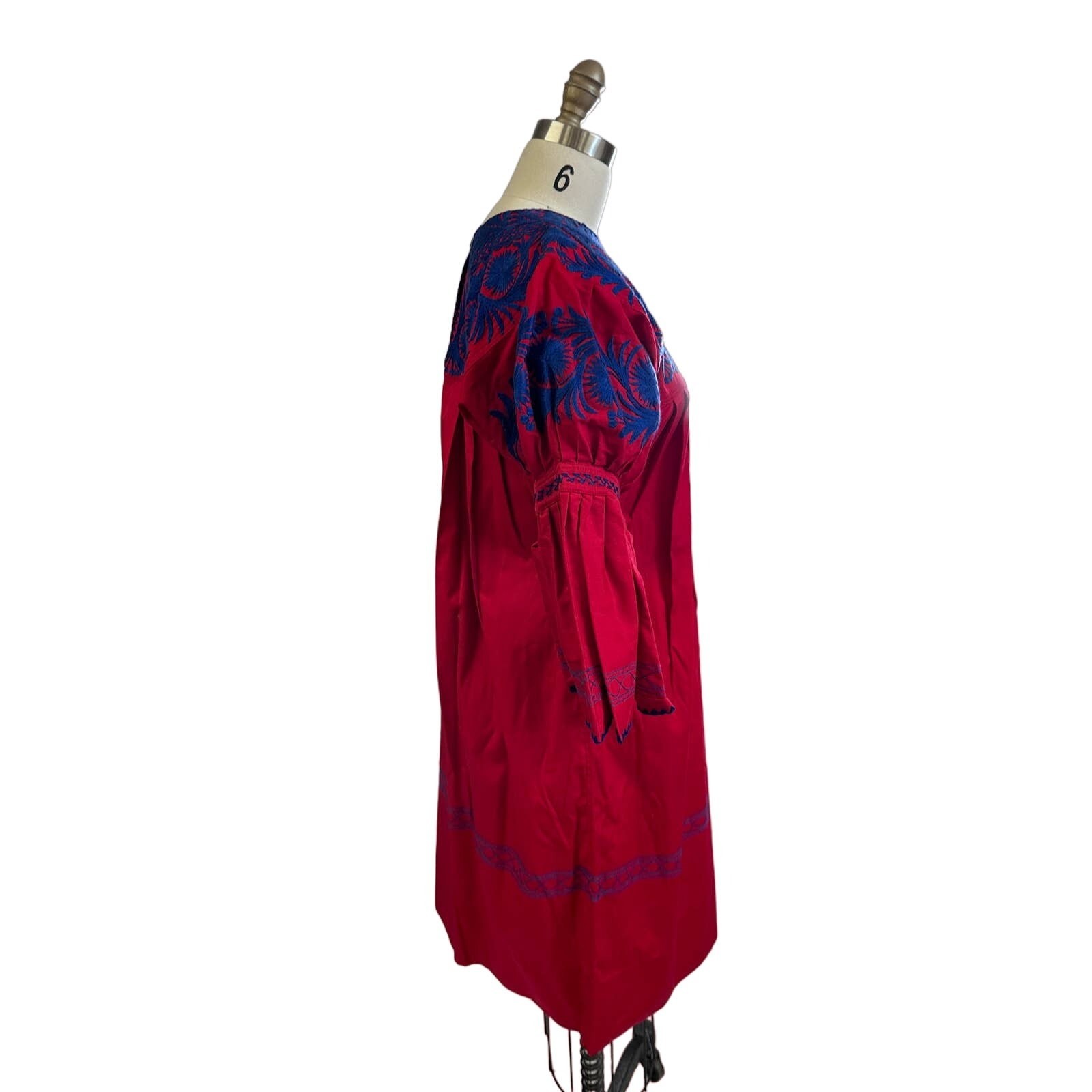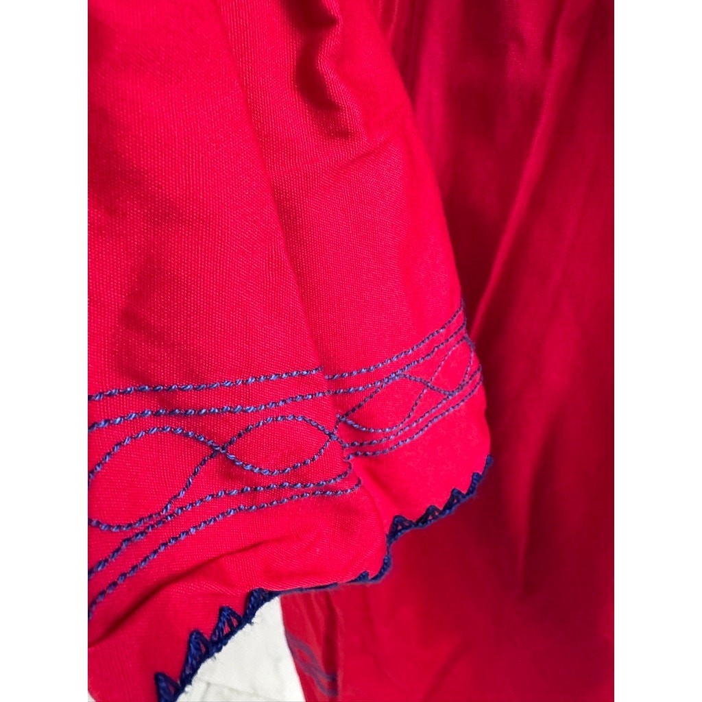 Step back into the free-spirited era of the 1970s with this stunning vintage peasant dress. Crafted from lightweight red cotton, this pull-over style dress features beautiful blue embroidery that creates a striking color combination. The design is perfected with a pleated bust, a button closure at the neck, and full, billowy sleeves from the elbow down. This piece is in perfect, like-new condition, a testament to its quality and careful preservation. By choosing this pre-owned garment, you are making a sustainable fashion choice and adding a unique, well-preserved piece of history to your wardrobe.