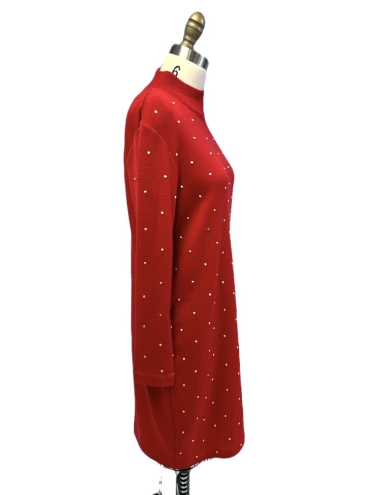 Vintage 1980s Outlander Red Wool Knit Dress Gold Studs Power Shoulders Sz M