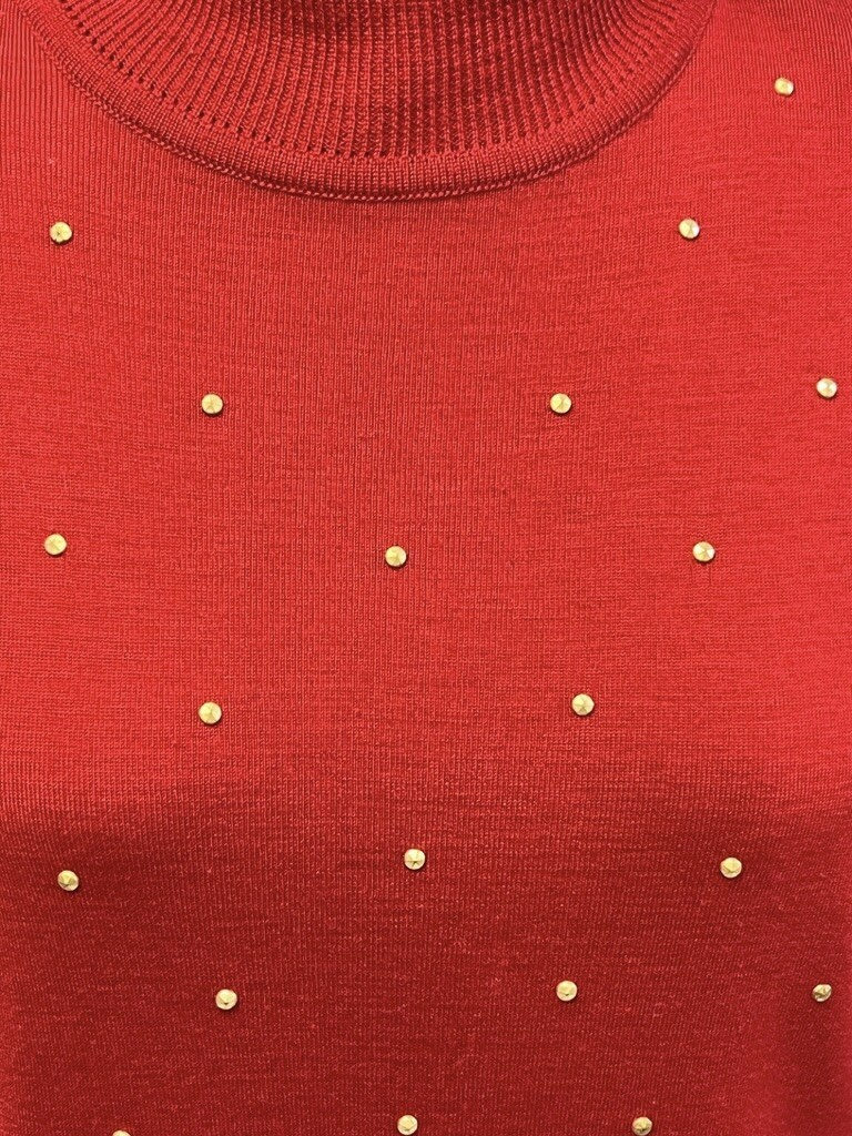 Bold and dramatic vintage 1980s Outlander red wool knit dress, covered in shimmering gold-tone studs throughout. Features structured padded shoulders, a sleek back zipper closure, and body-conscious silhouette. Classic power-dressing statement piece straight from the Dynasty era.