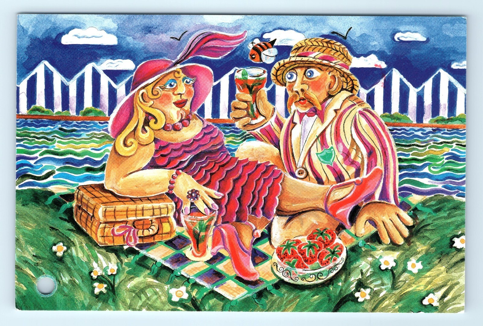 Vintage Divided Back Postcard Depicting a Painting of a Man and Woman on a Picnic by Artist Stefanie Hinton.