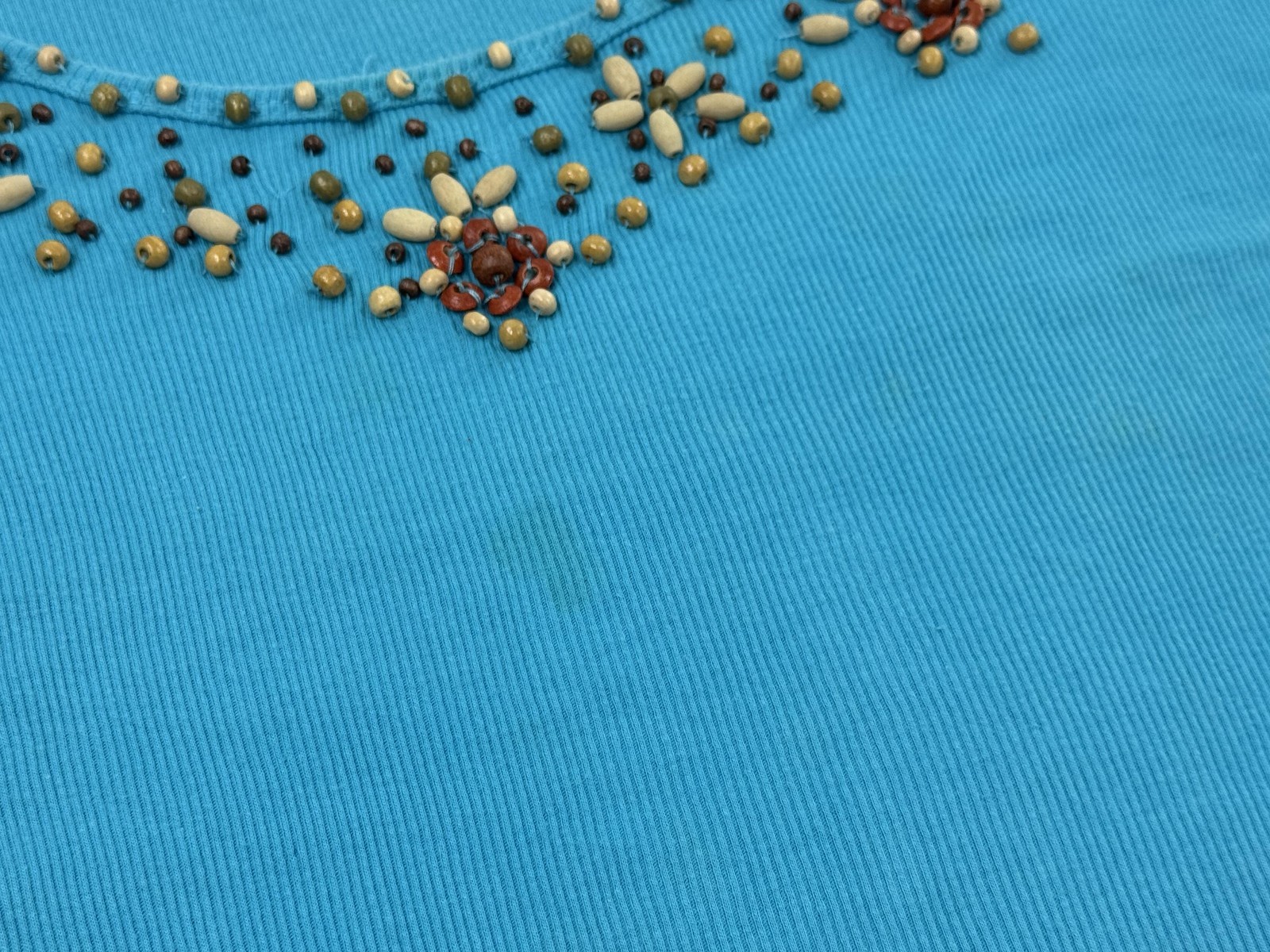 Design/features: Short-sleeve scoop neck shirt with ribbed knit body and embellished floral neckline; mixed wooden/resin beads in tan, brown, and green; pullover style; plus size fit