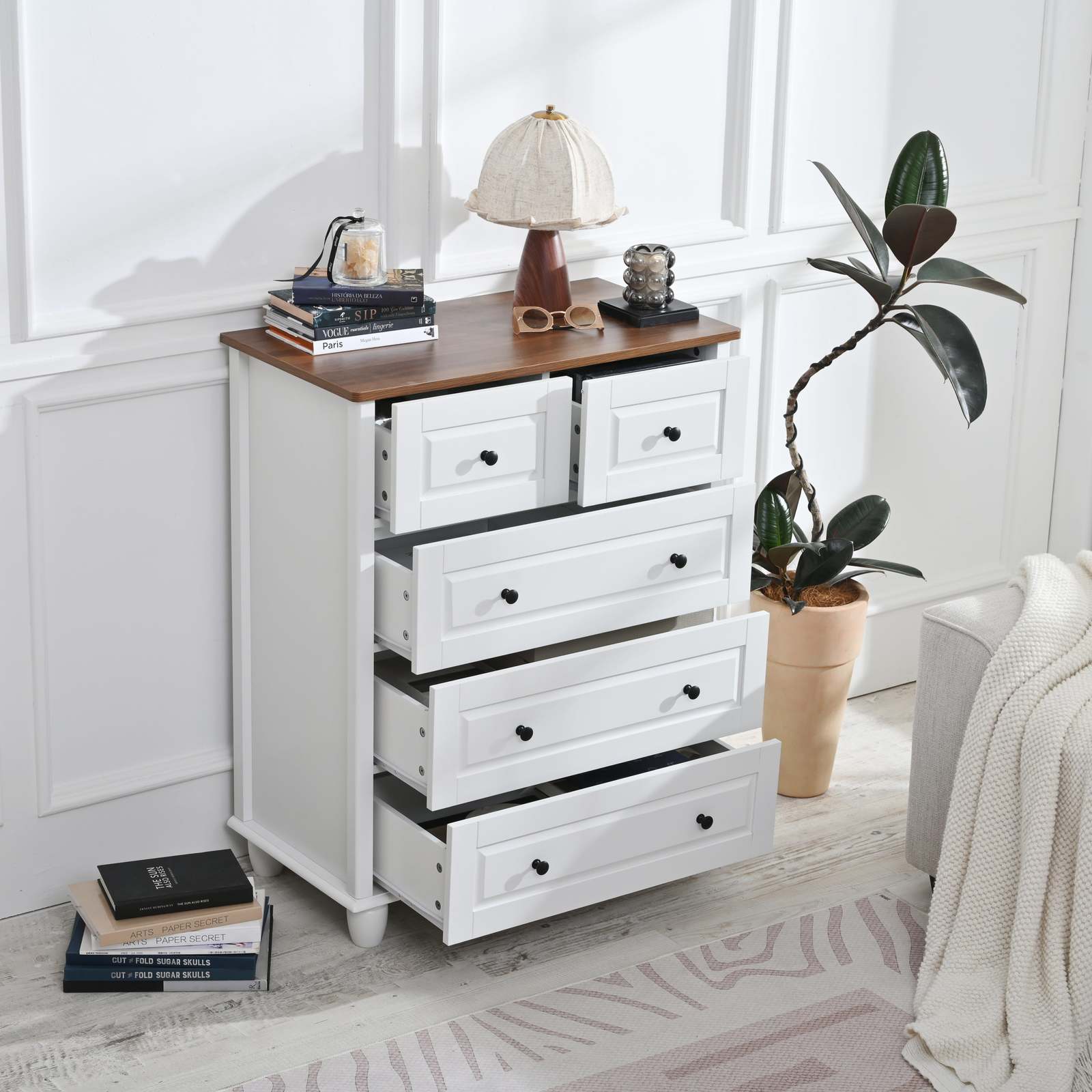 5 deep drawers and a wide tabletop provide ample space for sorting and organizing of daily necessities, such as cosmetics, daily ornaments, books, toys, and other stuff for a clean and tidy space