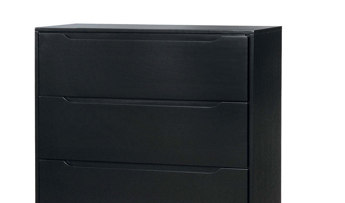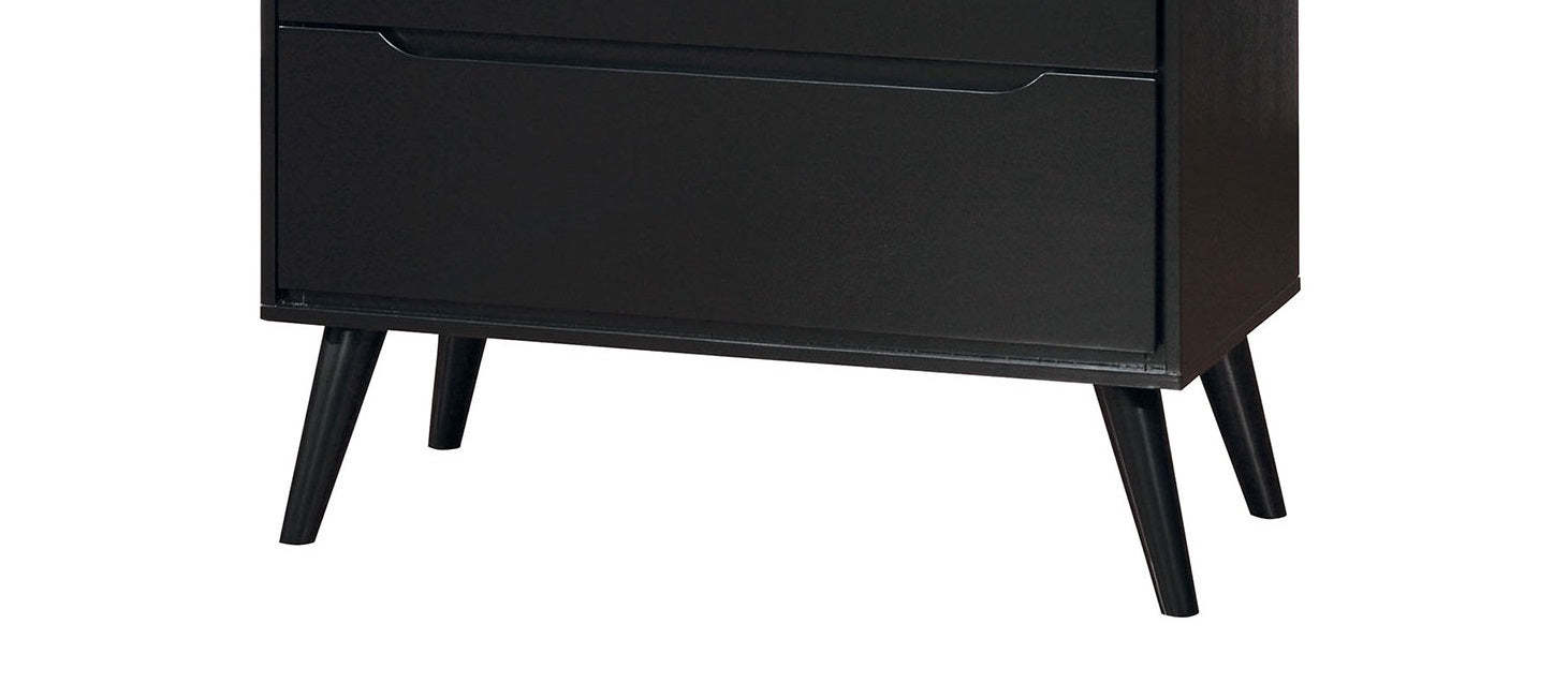 For a quick modern update to your home, this collection will add that trendy mid-century appeal. Featuring a Black finish, this chest boast slim flared legs and recessed handle drawer pulls.