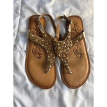 Gorgeous Naughty Monkey women?s sandals in size 8.5. These eye-catching gold thong-style sandals feature intricate beadwork, rhinestones, and faux pearls for a chic boho-glam look. Made with a genuine leather upper and durable rubber outsole for comfort and lasting wear. Perfect for summer parties, weddings, or casual vacation outfits.