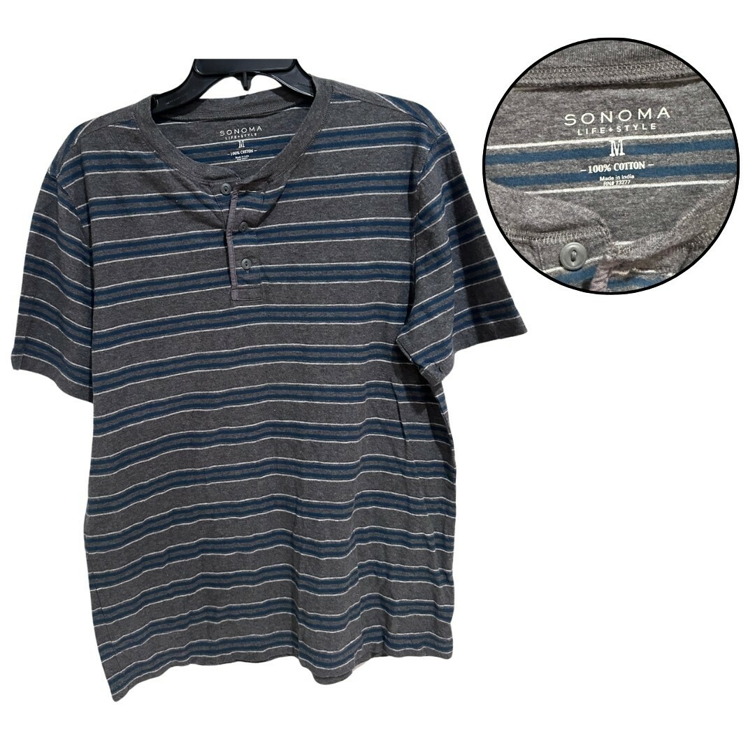 Sonoma Life+Style Men’s M Gray Striped Henley Short Sleeve Casual Shirt Tee