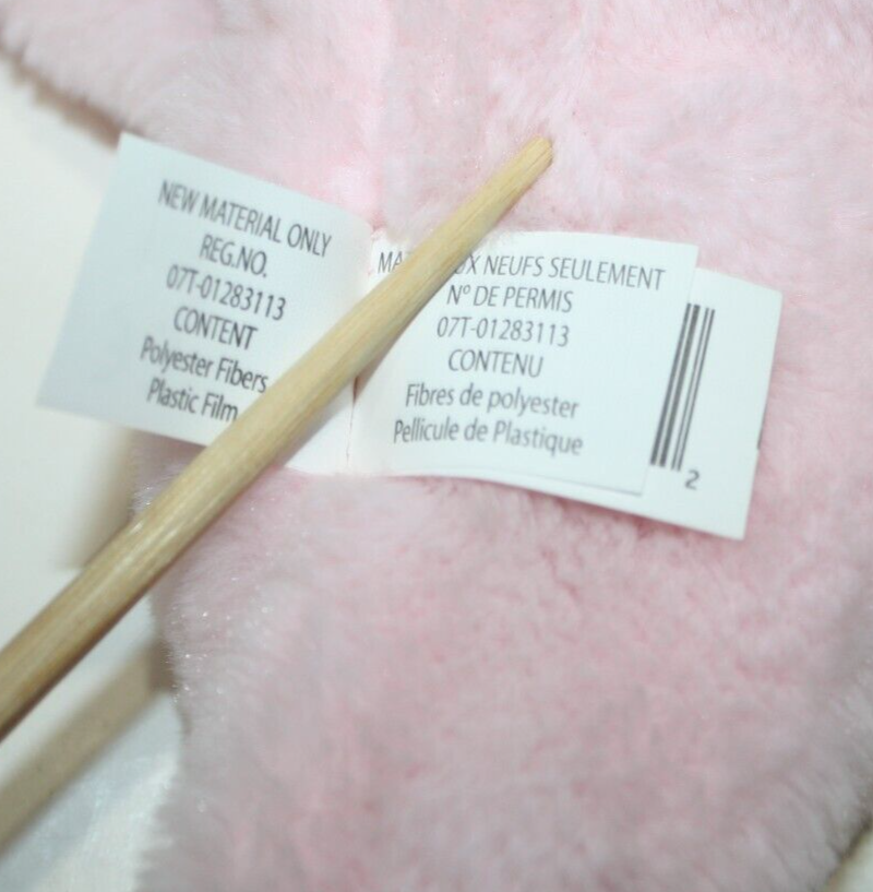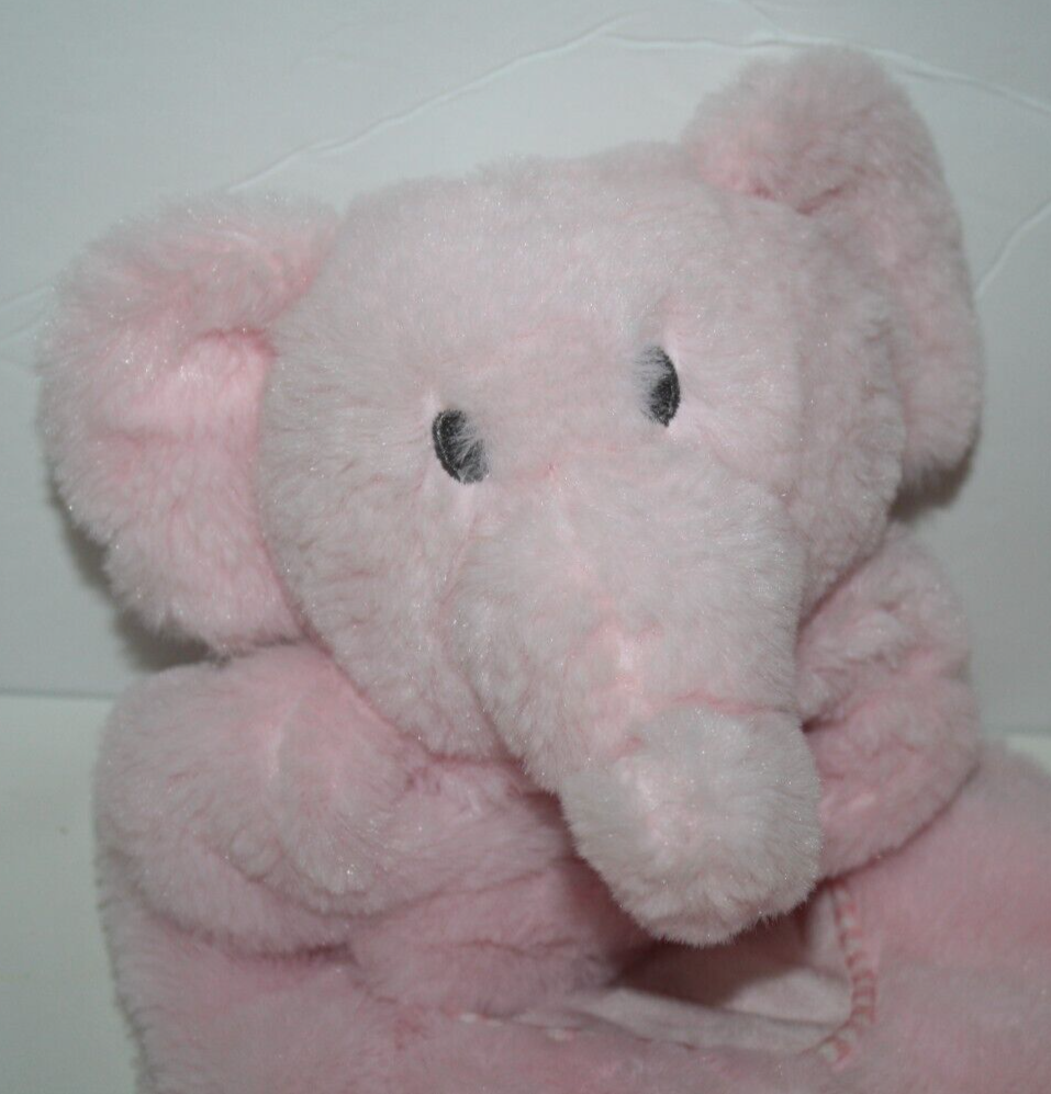 Very Buttery Soft Pink Plush Material, Elephant has sewn eyes, Stitched oval on topside with inner crinkle tummy and a rattle in the head, seam tags intact and plastic shelf hanger on top of head