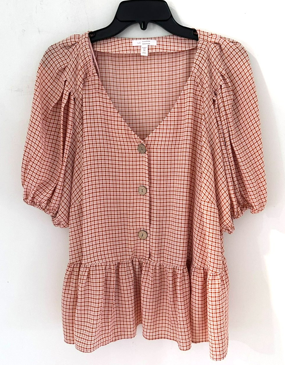 Add a fresh, feminine flair to your wardrobe with this LC Lauren Conrad Women?s Plus 1X Orange Gingham Ruffle Hem Blouse. Designed with charming puff sleeves and a flowy ruffled hem, this top blends comfort with modern elegance ? perfect for work, brunch, or everyday style.