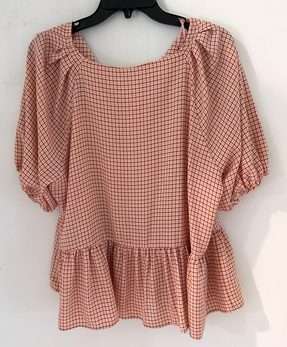 LC Lauren Conrad Women’s Plus 1X Orange Gingham Ruffle Hem Puff Sleeve Blouse