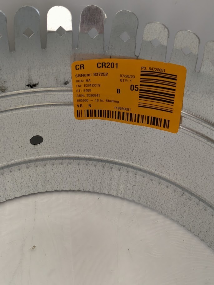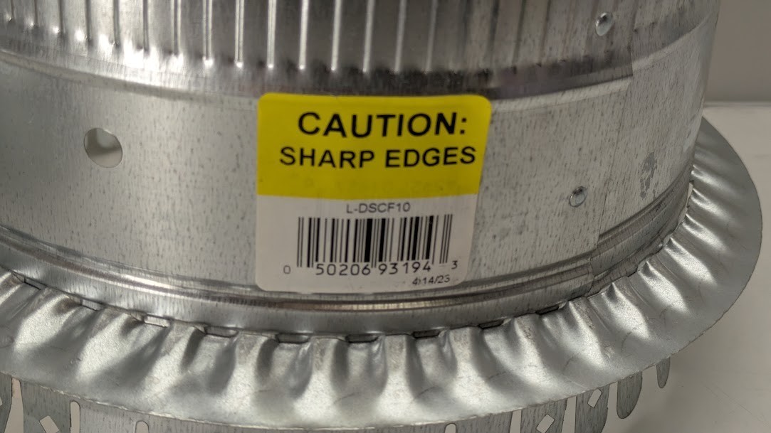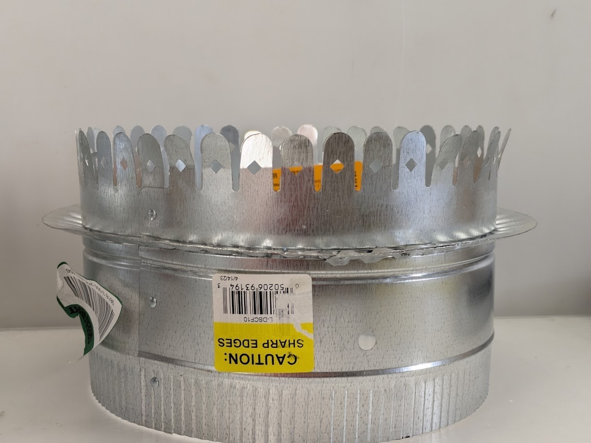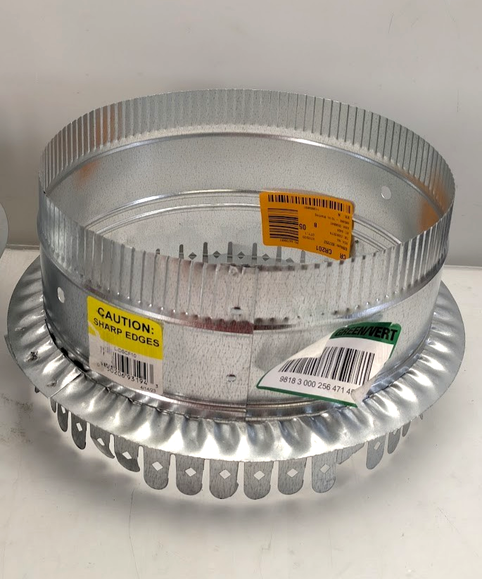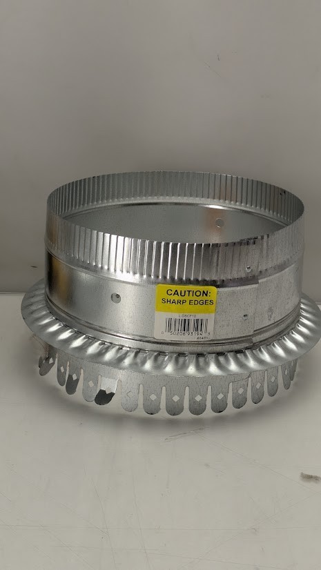 The Master Flow 10 in. Starting Collar is suitable for most HVAC applications. It provides a transition from a flat surface like a plenum (made from metal, ductboard or insulated) to round pipe or insulated flexible duct. It can be used with ductboard, an internally lined or unlined plenum. This galvanized steel starting collar features extra-long tabs to fit most duct board thicknesses.