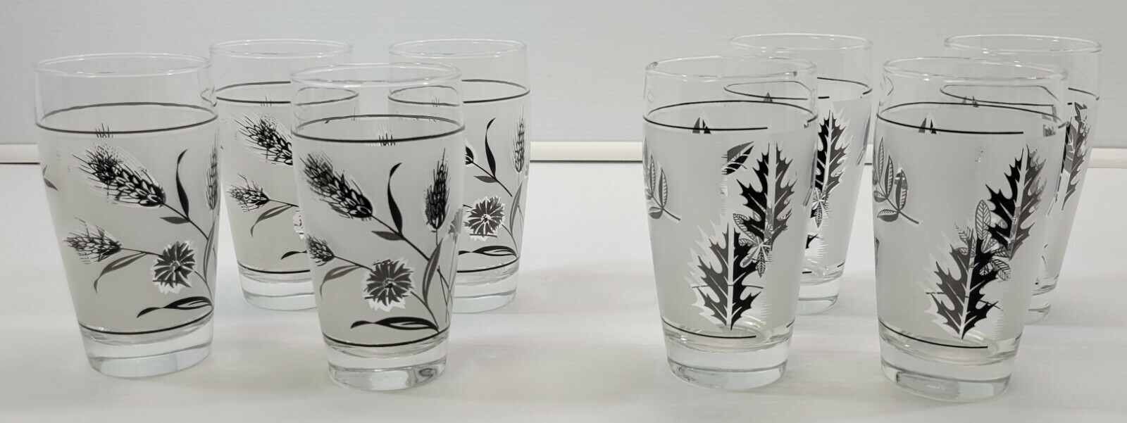 *MM) Lot of 8 Libbey Glass Company Silver Foliage Leaves and Wheat 10oz Tumblers
