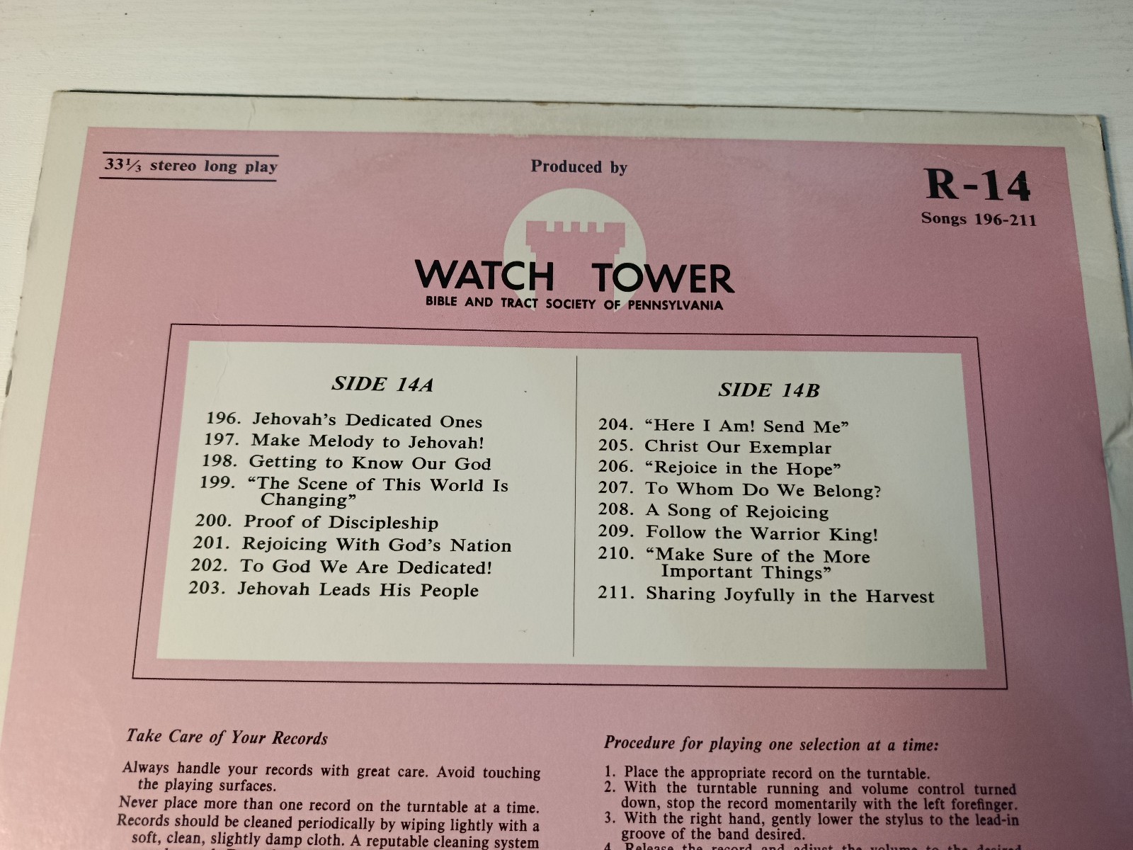 Published by the Watch Tower Bible and Tract Society of Pennsylvania in 1984, this LP is part de the historic collection Sing Praises to Jehovah, que covers several volumes edited entrelos 70s and 80s. el Volume R-14 includes los 196 to 211, performed by el official choirdelos Witnessesde Jehovah. It was used in international congregations and assemblies como part de their devotional musical repertoire.
