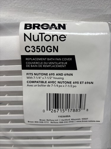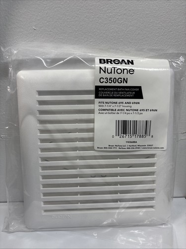 The Broan-NuTone C350GN Cover is designed to fit 8.75" ventilation fans, such as the 695 and 696N models. This white cover is a genuine product of the Broan-NuTone brand, ensuring both quality and compatibility with the specified fan models. It is a practical and stylish addition to any bathroom or kitchen, providing a seamless and efficient ventilation solution for indoor air quality improvement.