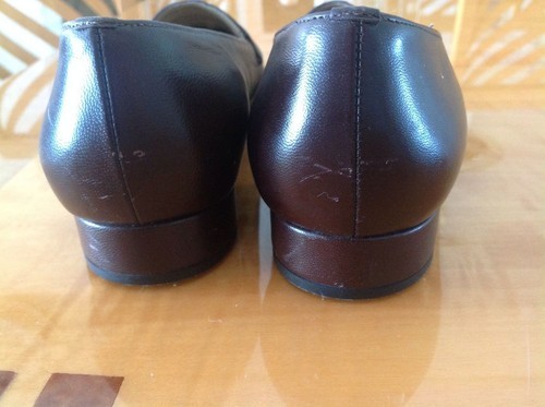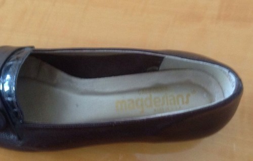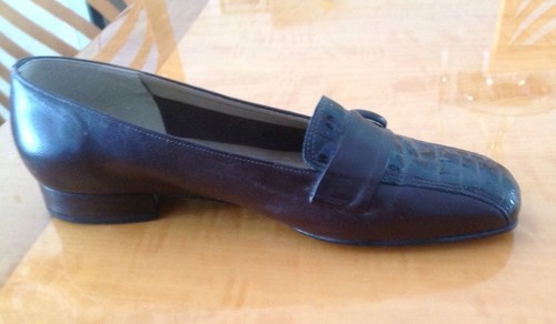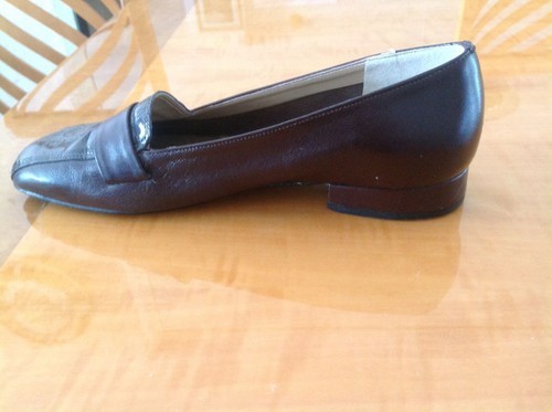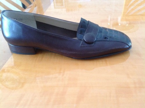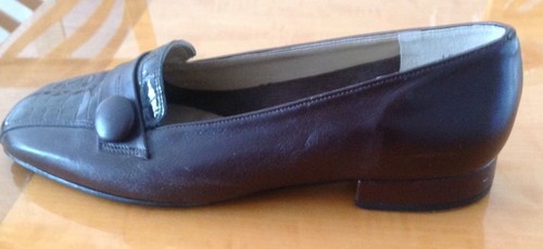 These California Magdesian brown leather lofers are in excellent used condition with only minimal signs of damage aside from a scratch on the outside of the right shoe (as seen in the photo). These loafers feature a brown leather upper with a front stamped alligator patent leather insert and a large brown leather covered button on each loafer. These loafers also have rubberized soles for added comfort and durability and a 1'' heel. Size 8 W.
