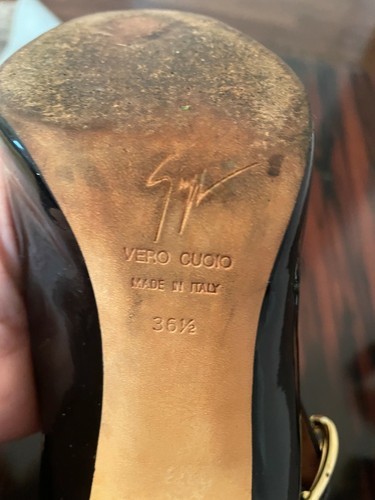 These GIUSEPPE ZANOTTI peep toe black stiletto heel patent leather shoes are in excellent used condition with no signs of damage of any kind. They feature:
