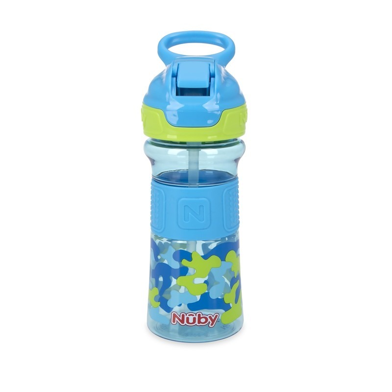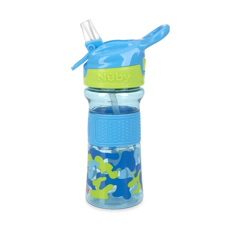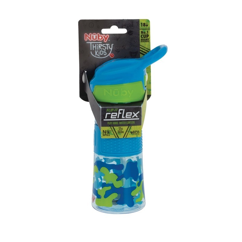 Leak-free and mess-free soft spout sippy cup for toddlers Unisex trainer cup in fun blue camouflage design Holds 12 fluid ounces (360 ml) of water, juice, or milk Soft silicone spout is gentle on sensitive gums and teeth Free-Flow spout allows for natural, easy sipping Cover helps keep the spout protected when closed Silicone band makes cup easy for small hands to hold Nuby sippy cup is suitable for ages 18+ months Made of BPA-free materials for parents' peace of mind Top-rack dishwasher safe for easy cleanup