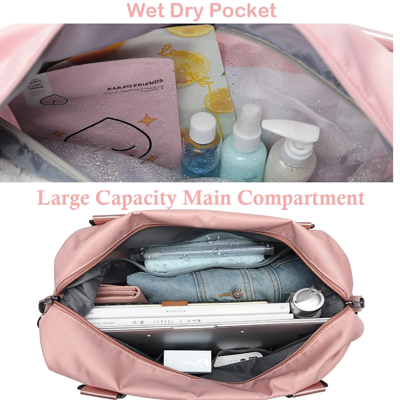 This weekender bag for women delivers roomy main compartment to store your clothes and other large items. A zippered waterproof PVC lined pocket for wet clothes,towels,swimsuits or toiletries.