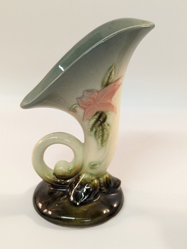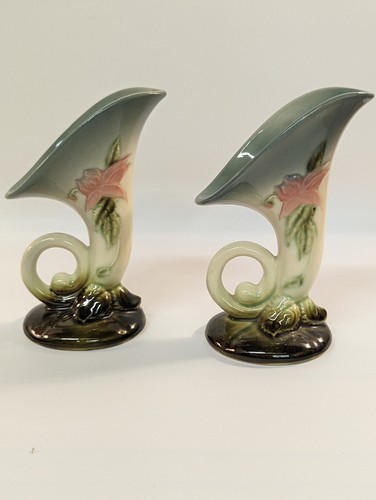 Pair of Vintage Hull Pottery Cornucopia W-2 - 5 1/2 Vases Pink Green Flowers.