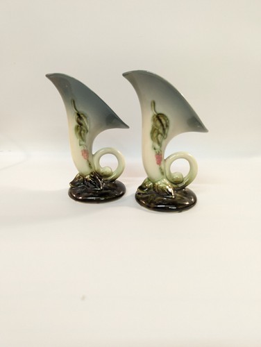 Pair of Vintage Hull Pottery Cornucopia Vases Pink Green Flowers W2 1950'S