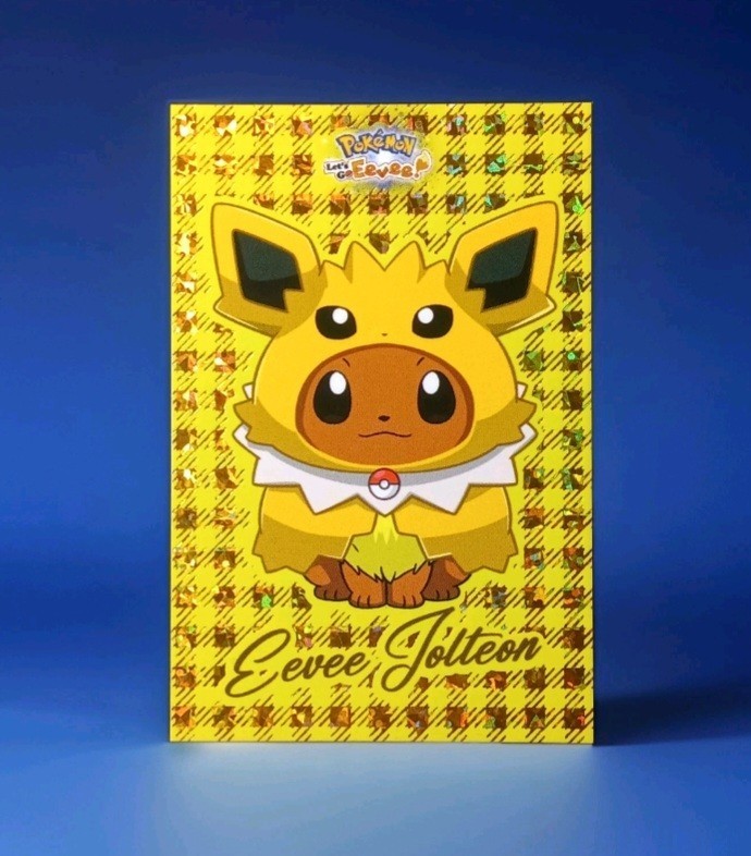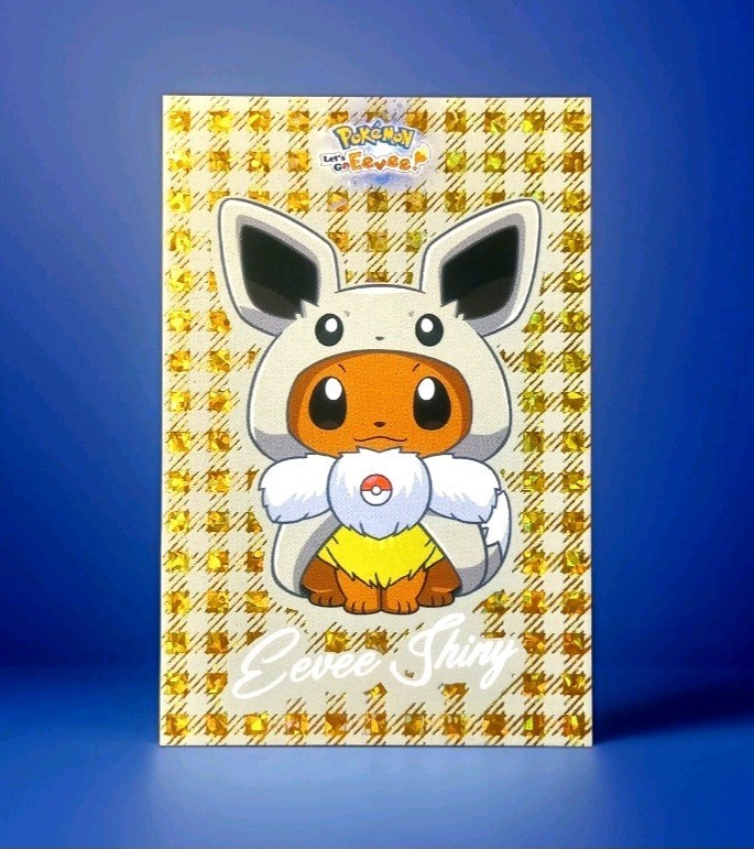 The product is a Pokemon Let's Go Eevee card featuring Eevee's Eeveelutions in Poncho form, with a Gold Ice Holo rarity these cards belong to the Lets Go Eevee Database set. The card showcases popular Pokemon characters like Umbreon, Espeon, Eevee, and Sylveon, and is a standard size made of card stock. Perfect for fans of Pokemon, this unique card is a must-have for any collector.