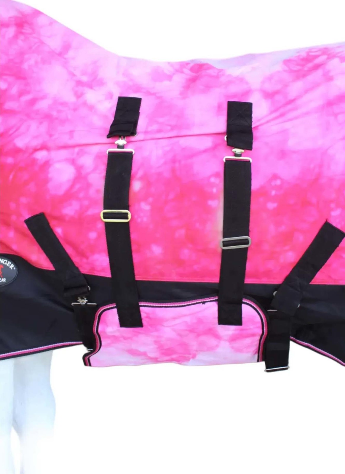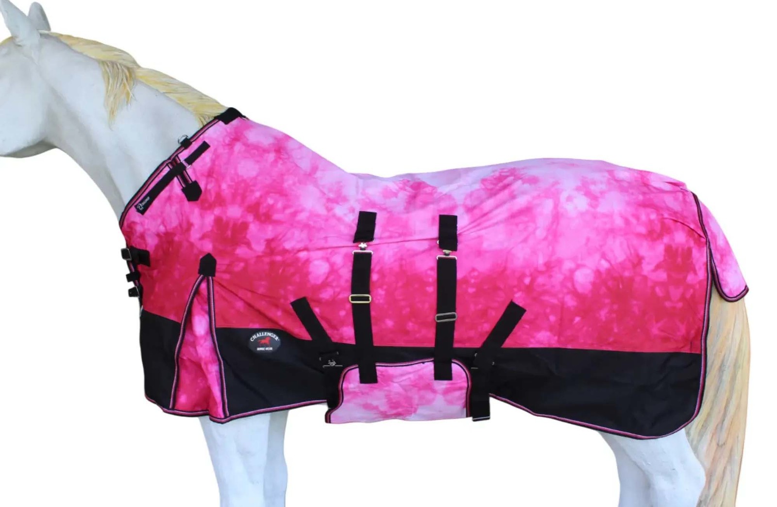 Challenger medium-weight horse blanket features a waterproof, breathable, and durable 1200D outer shell constructed with rip-stop weave fabric. Fleece lined underside to help keep your horse warm. The dual front buckle snap closure, cross surcingles, and elastic leg straps help secure blanket in place and ensure a comfortable fit. The reinforced, double-sewn stress points offer additional reinforcement to help prevent tears, while the fleece wither helps provide protection from rubbing. Shoulder gussets allow for freedom of movement. Tail cover provides additional protection from moisture. Hardware made of rust-free stainless steel.