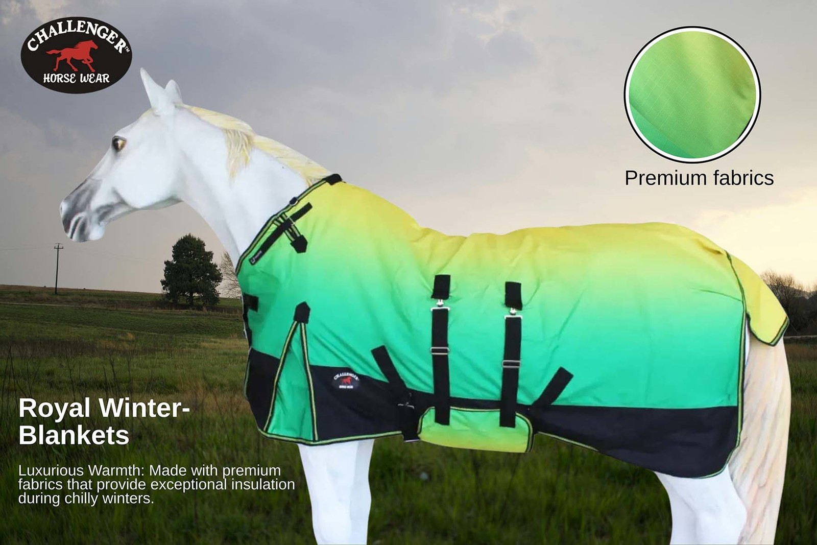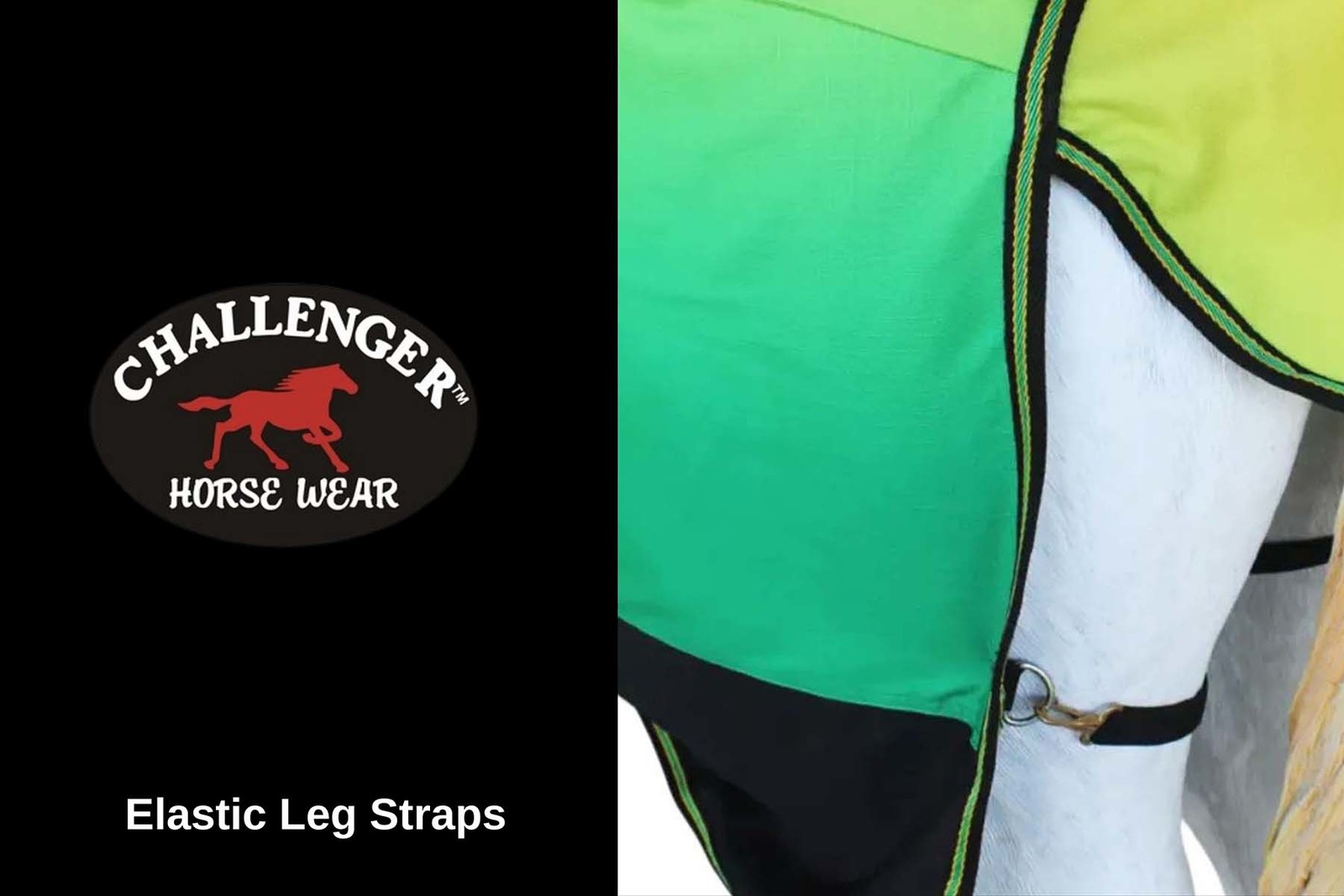 Challenger medium-weight horse blanket features a waterproof, breathable, and durable 1200D outer shell constructed with rip-stop weave fabric. Fleece lined underside to help keep your horse warm. The dual front buckle snap closure, cross surcingles, and elastic leg straps help secure blanket in place and ensure a comfortable fit. The reinforced, double-sewn stress points offer additional reinforcement to help prevent tears, while the fleece wither helps provide protection from rubbing. Shoulder gussets allow for freedom of movement. Tail cover provides additional protection from moisture. Hardware made of rust-free stainless steel.