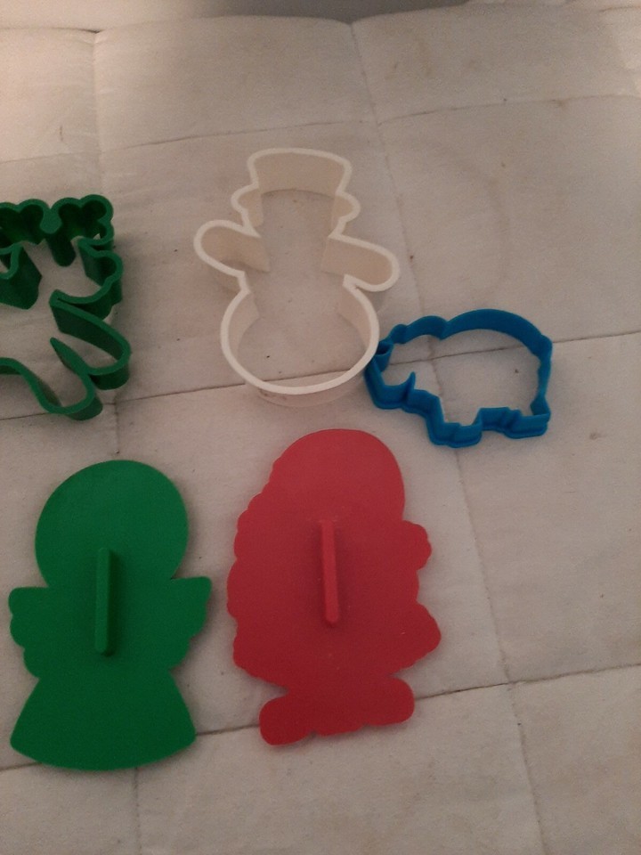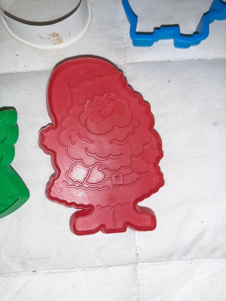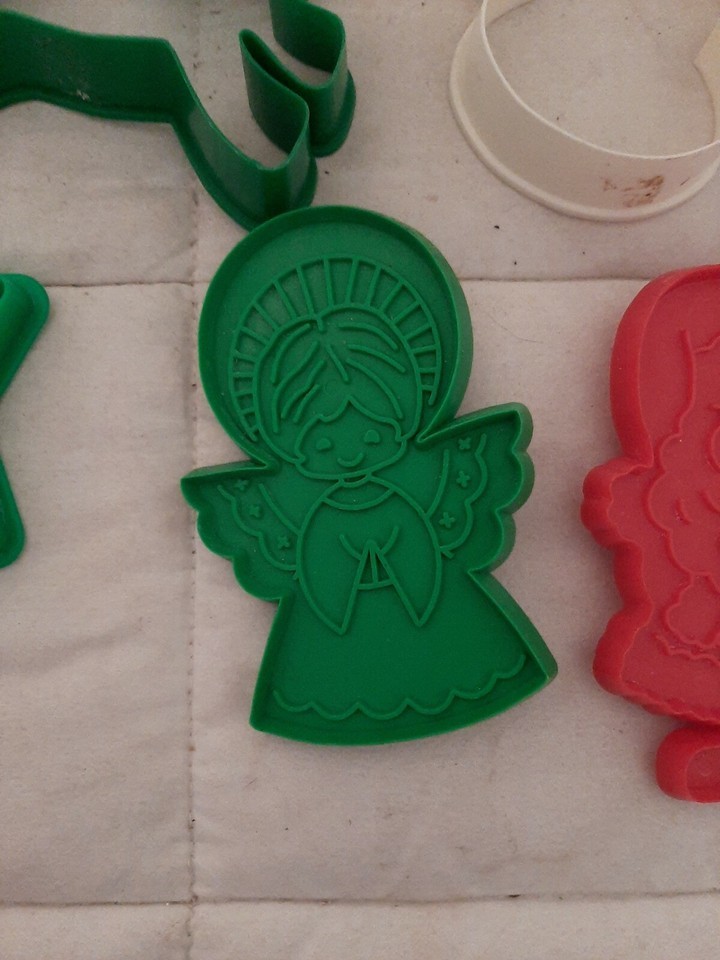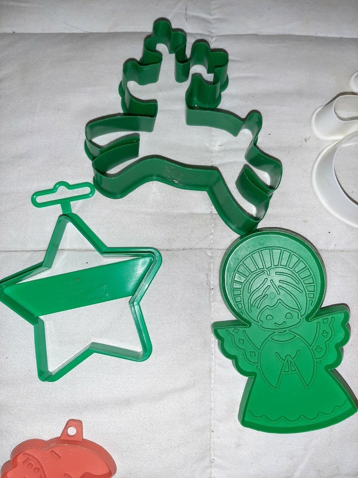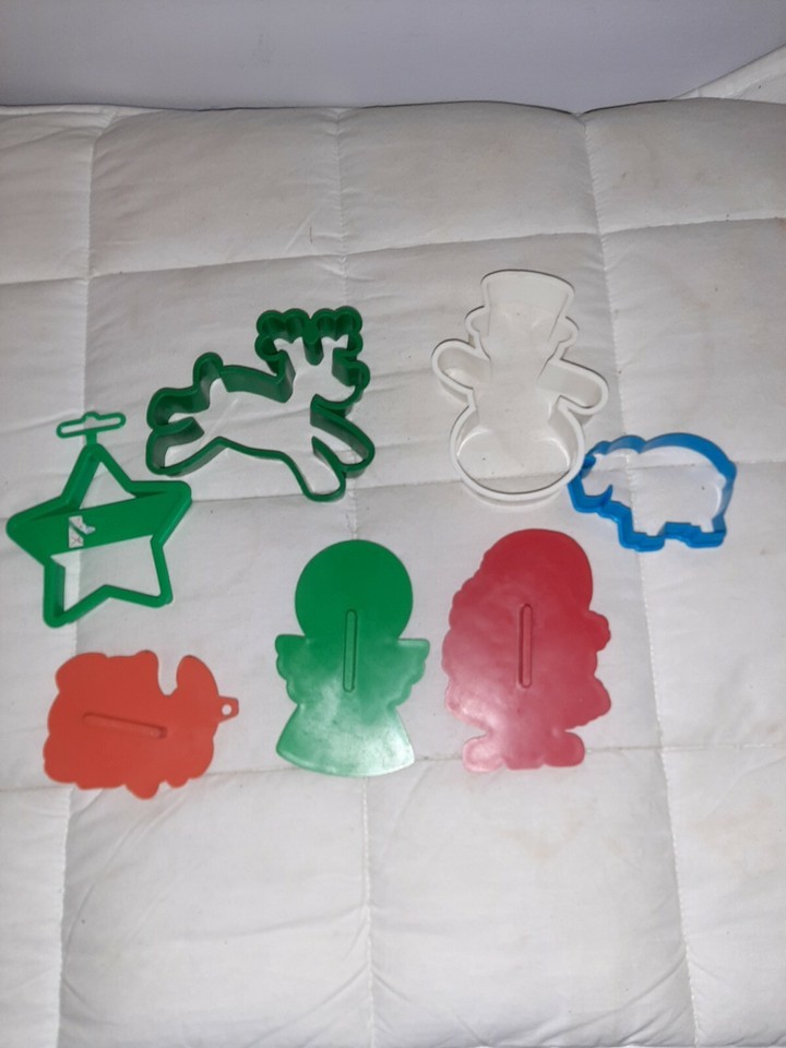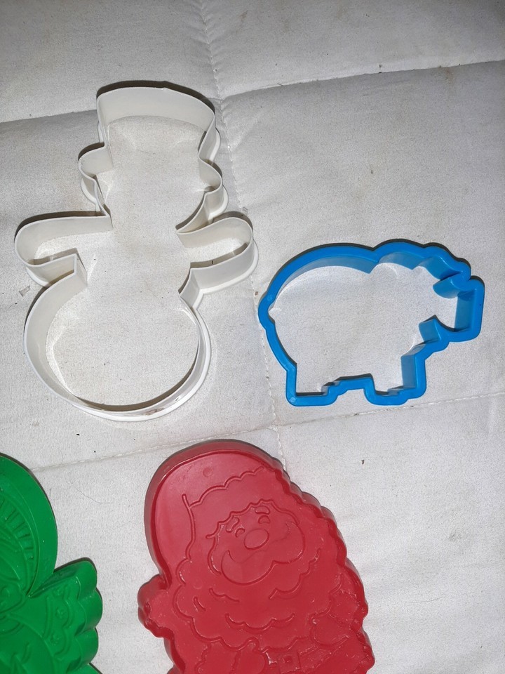 Vintage Hallmark Christmas/Halloween Cookie Cutters Lot Of 7 Hard Plastic. This lot includes: Blue Pig, White Snowman, and Green Reindeer all open style Hallmark cutters. The green open star is a Wilton. The orange witch, Red Santa, and Green Angel are detailed Hallmark cutters.