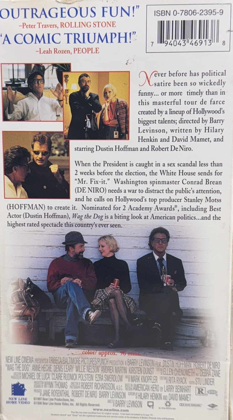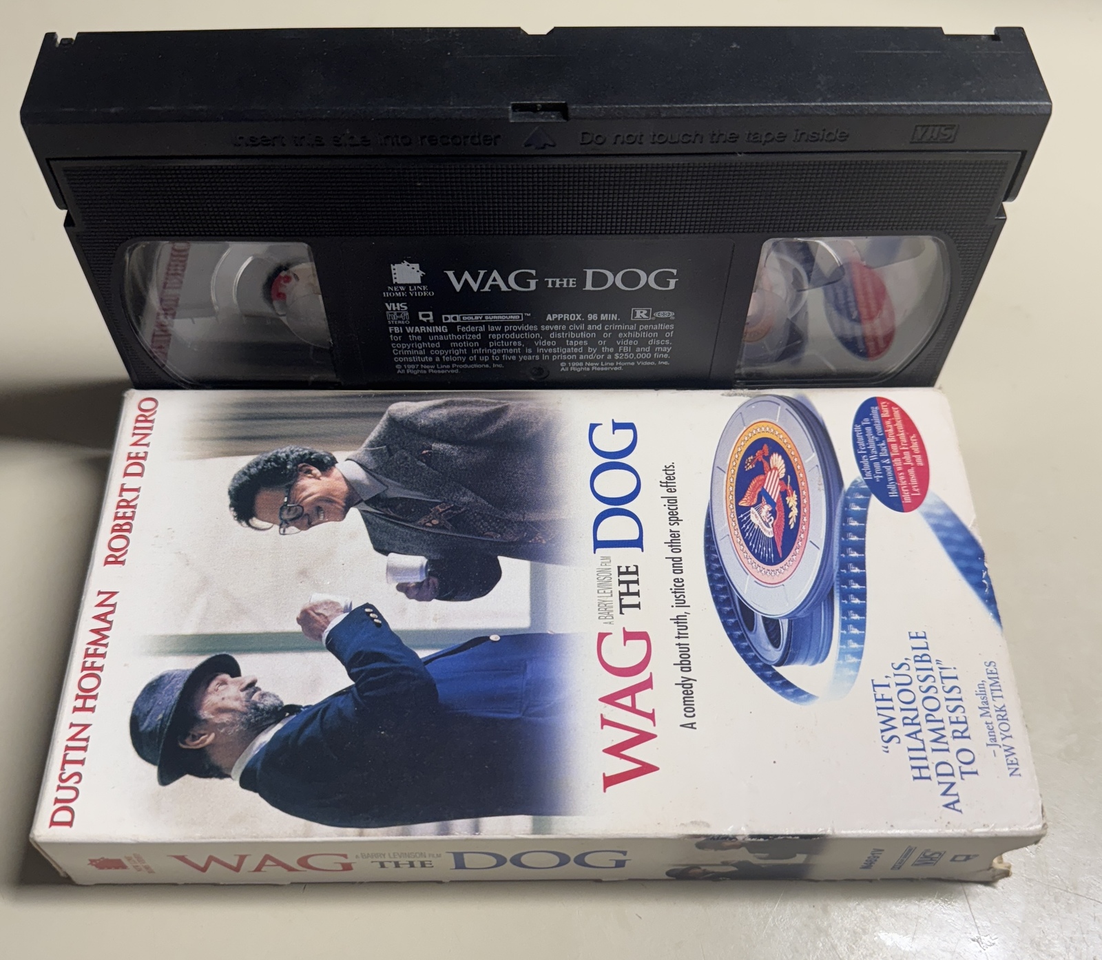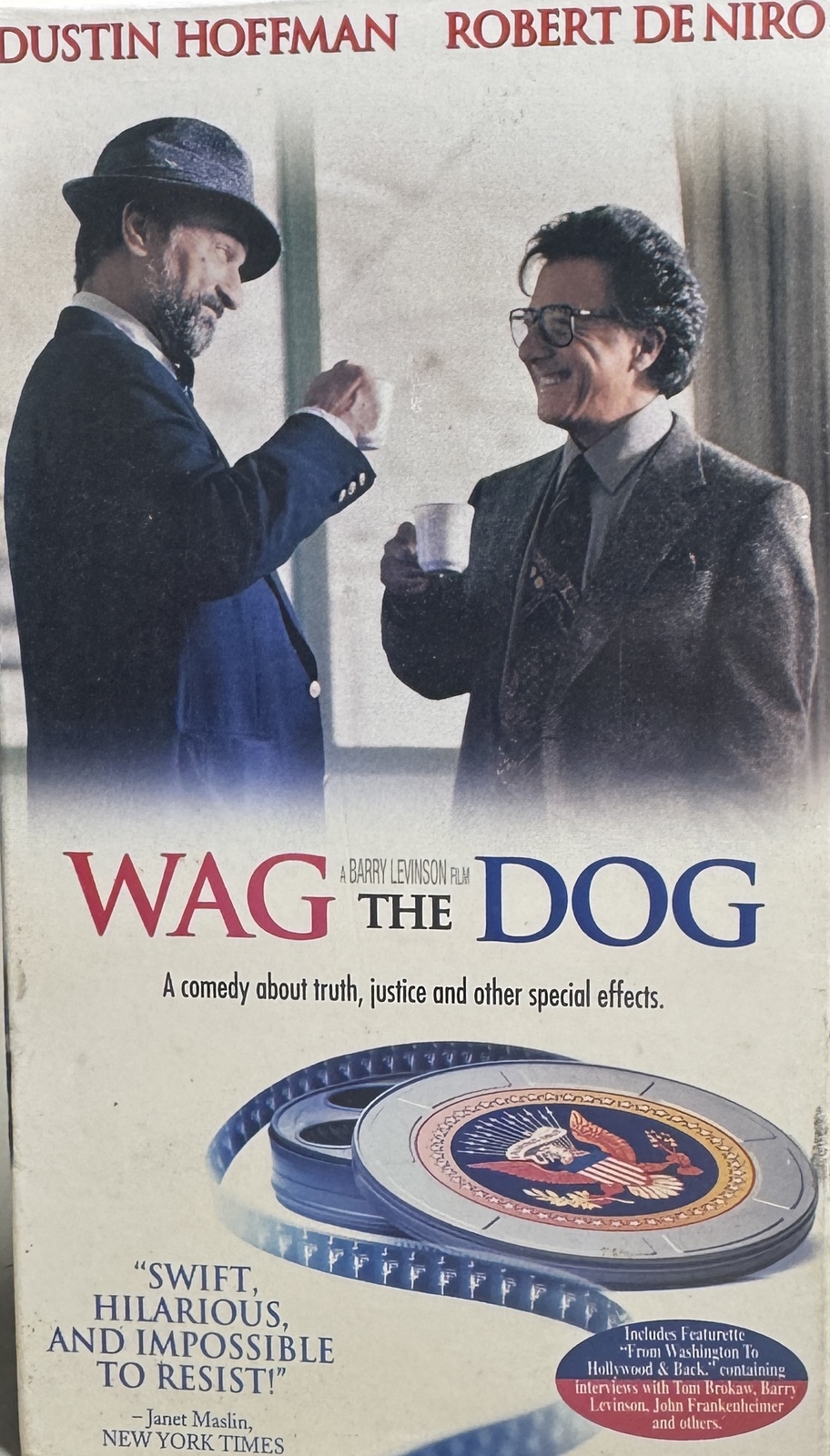 This is the standard edition VHS release of the acclaimed 1997 political satire film, Wag the Dog. Directed by Academy Award winner Barry Levinson, this black comedy offers a sharp, witty look at media manipulation and political spin.