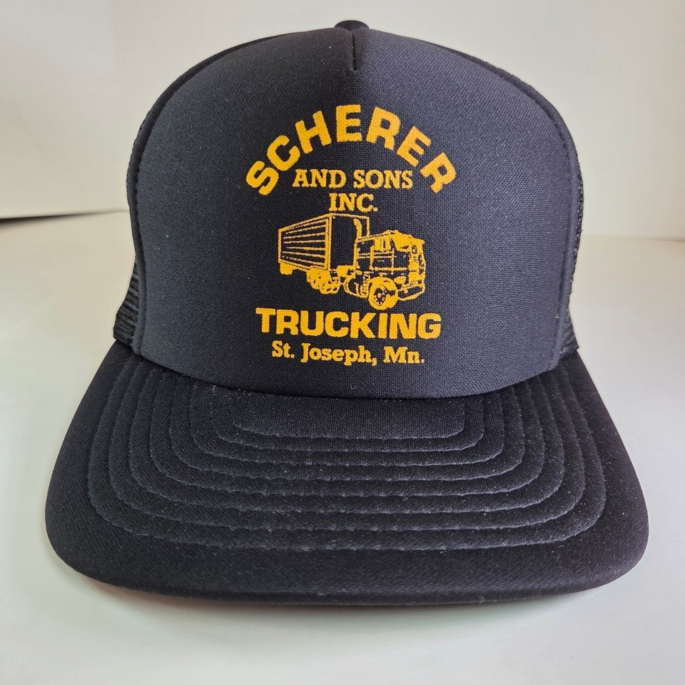 Authentic vintage promotional hat from Scherer Sons Inc. Trucking, based in St. Joseph, MN (est. 1951). This black snapback features a bright gold truck graphic and bold ?Scherer and Sons Inc. Trucking St. Joseph, MN? text embroidered on the foam front, backed by breathable mesh. A classic turf of regional trucking memorabilia with strong local charm.