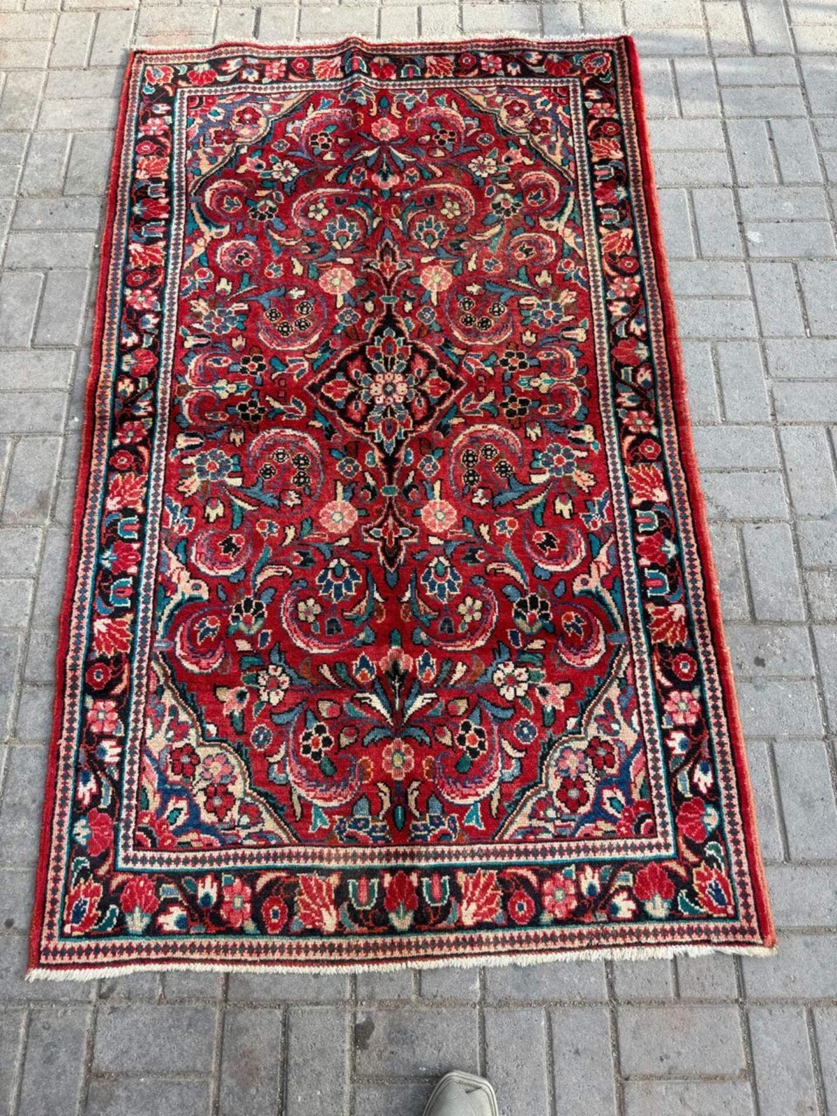 Handmade Antique Persian Sarouk Rug 4' x 6.8', 1920s This exquisite antique Persian Sarouk rug from the 1920s is a testament to the enduring formality and quality of classic Persian weaving. Sarouk rugs are globally celebrated for their dense, luxurious pile and iconic, rich coloration. Furthermore, its sophisticated all-over floral design and velvety texture represent the pinnacle of early 20th-century artistry. Consequently, this piece is a timeless investment that brings a sense of refined elegance and history to any interior. A Classic All-Over Floral Design The rug features the classic Sarouk pattern, where elegant bouquets, delicate vines, and detailed palmettes appear to float across the field. This intricate design is rendered with remarkable precision and balance. Moreover, the motifs are arranged in a harmonious and repeating sequence that creates a sense of rhythmic beauty. The overall composition is one of formal grandeur, showcasing the masterful drafting skills of the Sarouk weavers. A Rich and Velvety Palette The canvas is dominated by a signature, velvety deep red or cranberry ground, a hallmark of fine Sarouk rugs. This lush background provides a stunning contrast for the intricately detailed motifs in navy blue, ivory, and soft green. The saturation of the color suggests the use of high-quality, stable vegetable dyes that have matured beautifully over time. This palette exudes warmth, luxury, and a deeply inviting charm. Elegant and Versatile Presence Woven from 100% hand-knotted wool, this rug possesses a famously dense and durable pile that promises longevity. It is presented in good original antique condition, featuring the elegant patina and softened colors highly desired by collectors. Its versatile size is perfect for anchoring a formal entryway, serving as a striking focal point in a seating area, or layering over larger flooring to define a space with luxurious texture. Product Details Age: Circa 1920s Origin: Persia, Sarouk Region Material: 100% Hand-Knotted Wool Condition: Good (With a dense pile and elegant patina consistent with age) Dimensions: In Feet: 4' 0" x 6' 8" In Centimeters: 122 cm x 203 cm