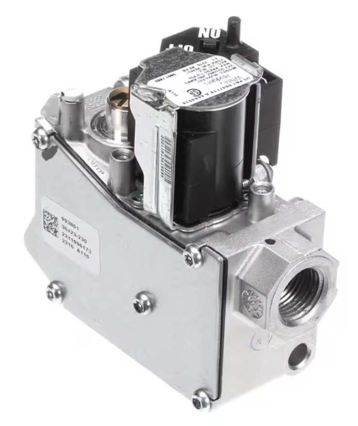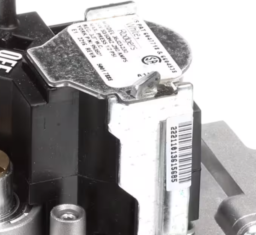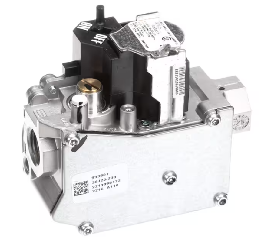 The York 36J23-230 (993801, 2211096173) Gas Valve is a genuine OEM replacement valve designed for York natural gas heating systems. It regulates gas flow to the burner for safe and efficient operation, ensuring precise ignition and consistent combustion. This valve operates on 24 volts at 50/60 Hz, making it compatible with a wide range of York furnaces and heating units that use natural gas fuel.