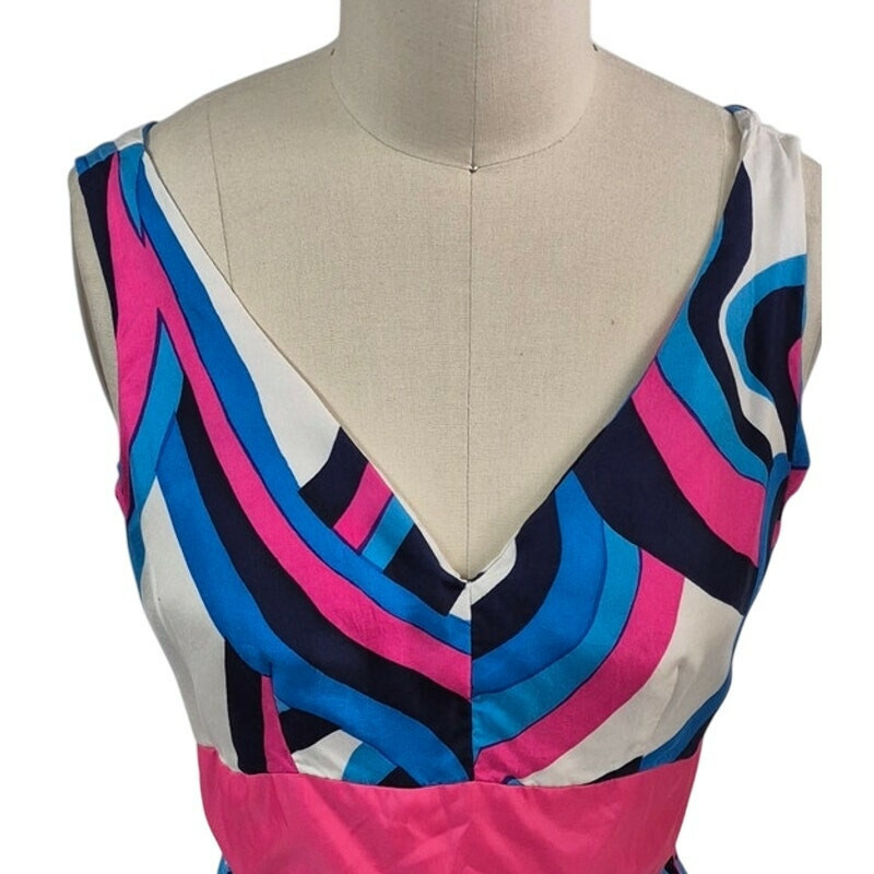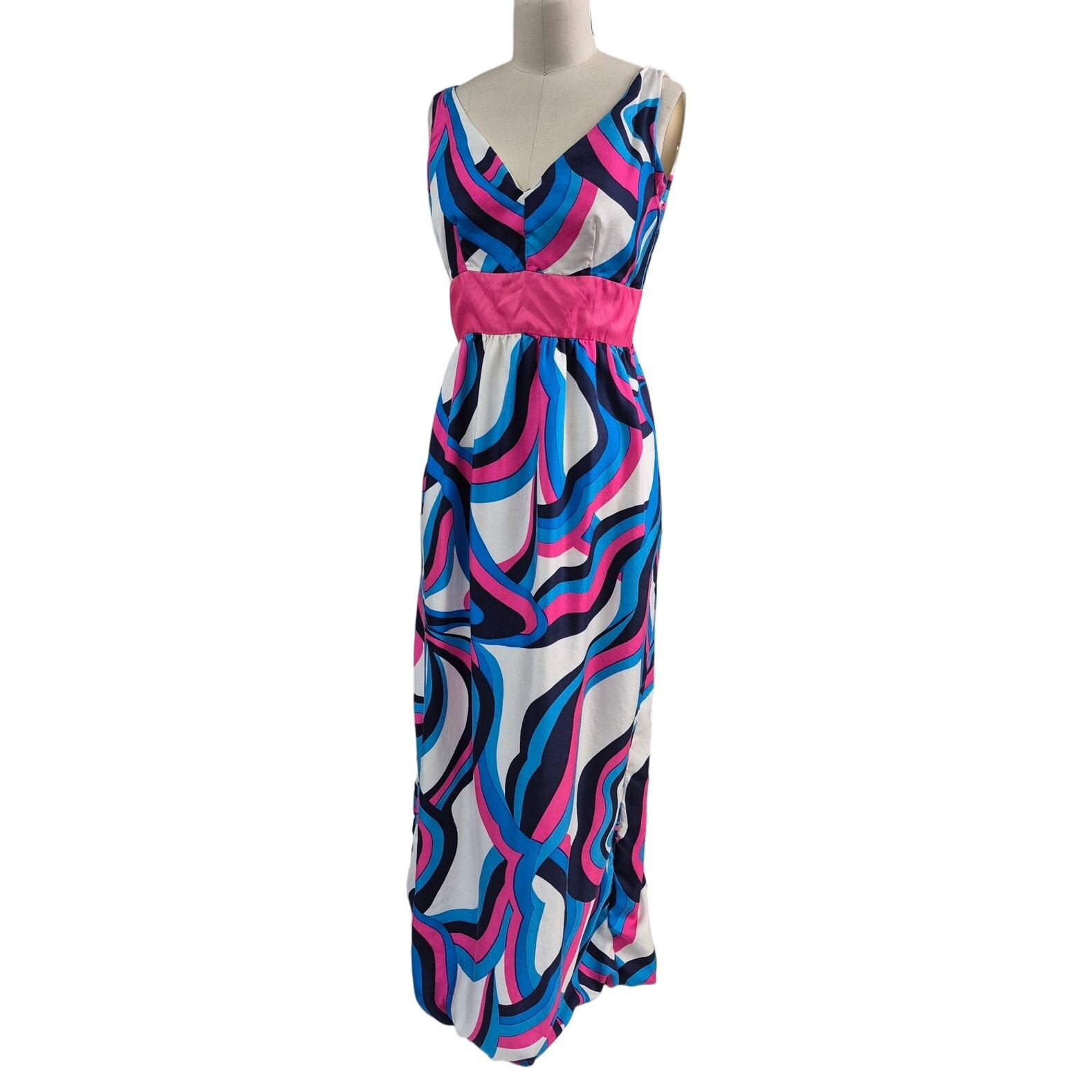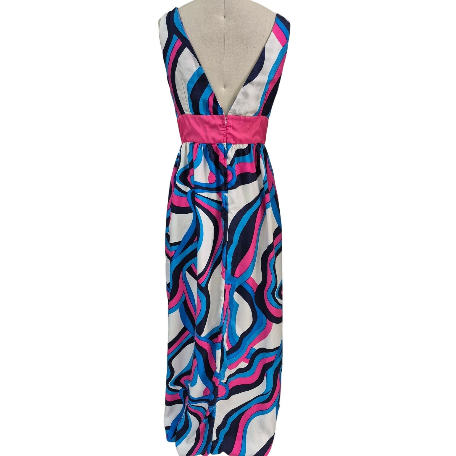 Vintage 60s-70s psychedelic Pink/White/Blue Silk Abstract Print Maxi Dress with a Deep V Back and side seam pockets featuring a metal back zipper. Completely lined. This groovy gown fits perfectly into today's fashion world. It has been washed but not pressed, and it will look like a million-dollar dress once you have that done?no stains, holes, or signs of wear.
