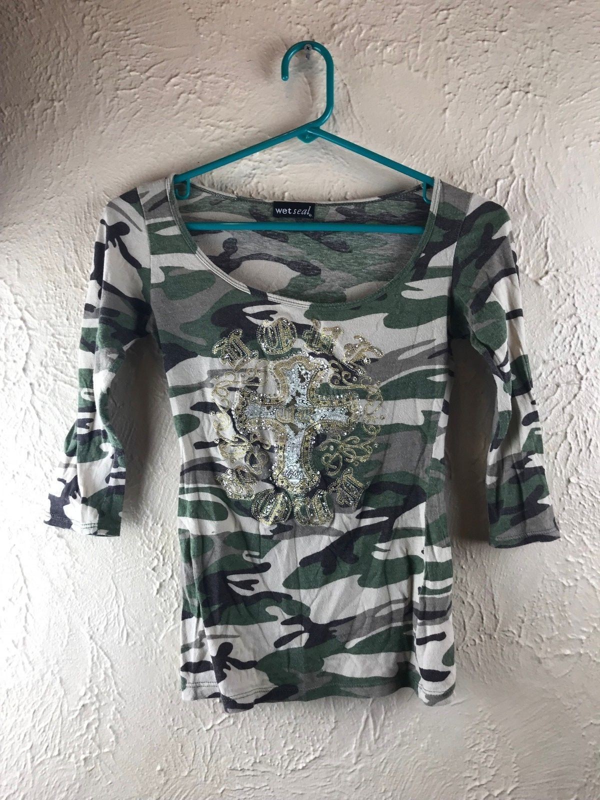 Wet Seal scoop camo 3/4 Sleeve T-shirt Women's S stretch cotton