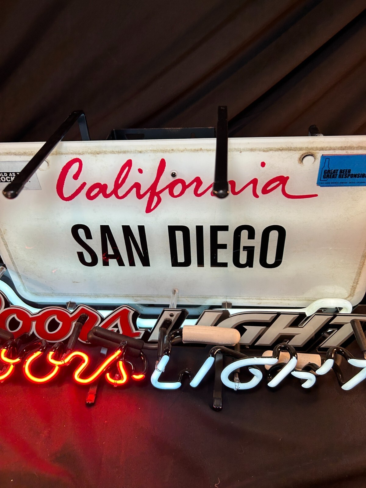 This rare Coors Light neon sign features a California license plate design customized with ?San Diego.? A perfect centerpiece for any bar, man cave, or collector's wall, this sign delivers classic breweriana charm and vibrant light. Manufactured by Beer Sign Manufacturer, Inc., it?s a tough find and a great conversation starter for fans of vintage beer memorabilia.