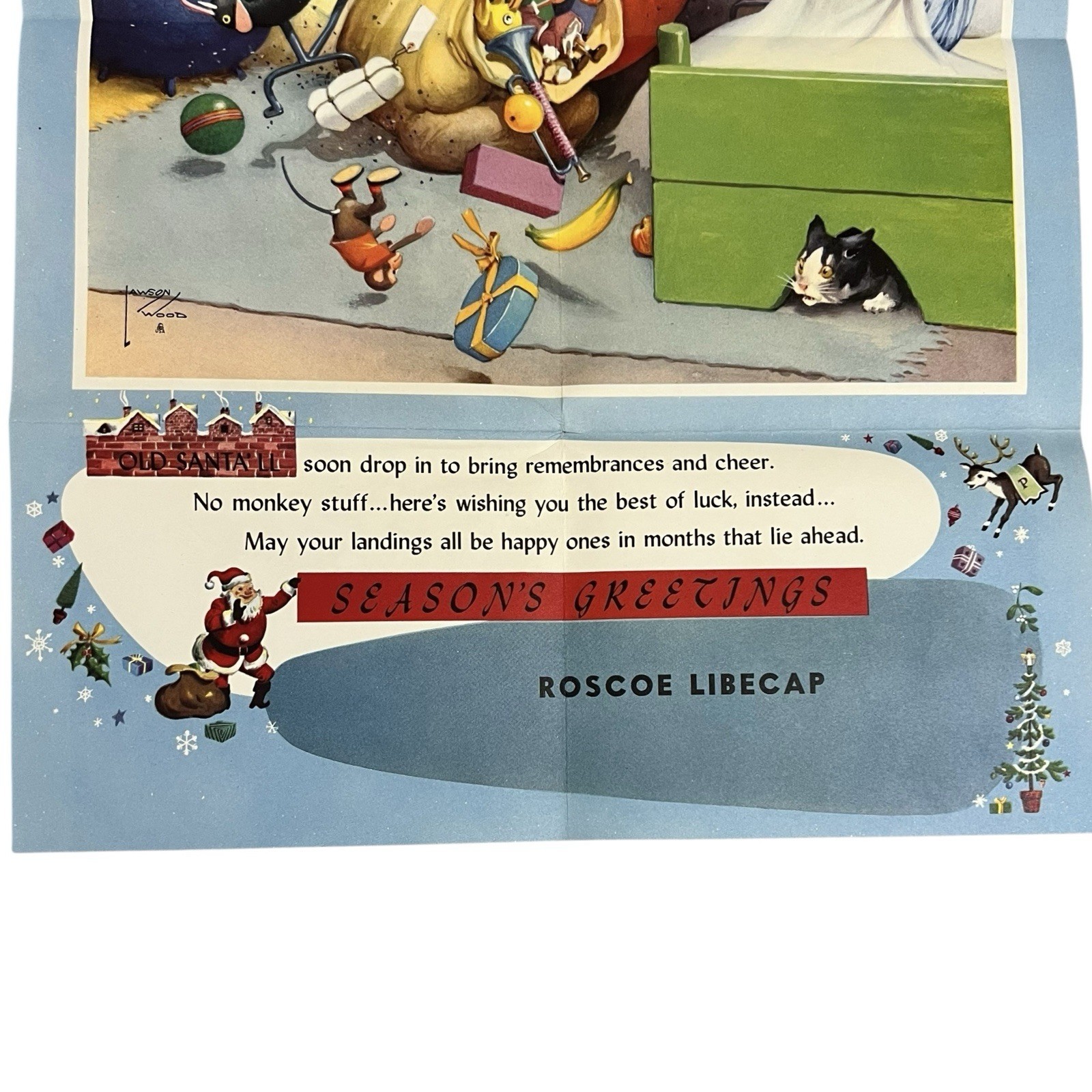 This richly illustrated card unfolds to reveal multiple colorful scenes, each filled with comic detail and signed Lawson Wood within the art. The front reads ?The year-end brings a welcome pause? it?s pleasant to relax? and the interior greetings continue through to ?Season?s Greetings ? Roscoe Libecap.?