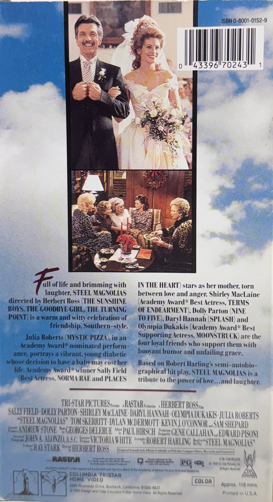 The tape features an all-star ensemble cast including Sally Field, Dolly Parton, Shirley MacLaine, Daryl Hannah, Olympia Dukakis, and Julia Roberts, and was directed by Herbert Ross. It tells the heartwarming and poignant story of a close-knit group of Southern women in a small Louisiana town who gather at a local beauty parlor and support each other through life's joys and sorrows.