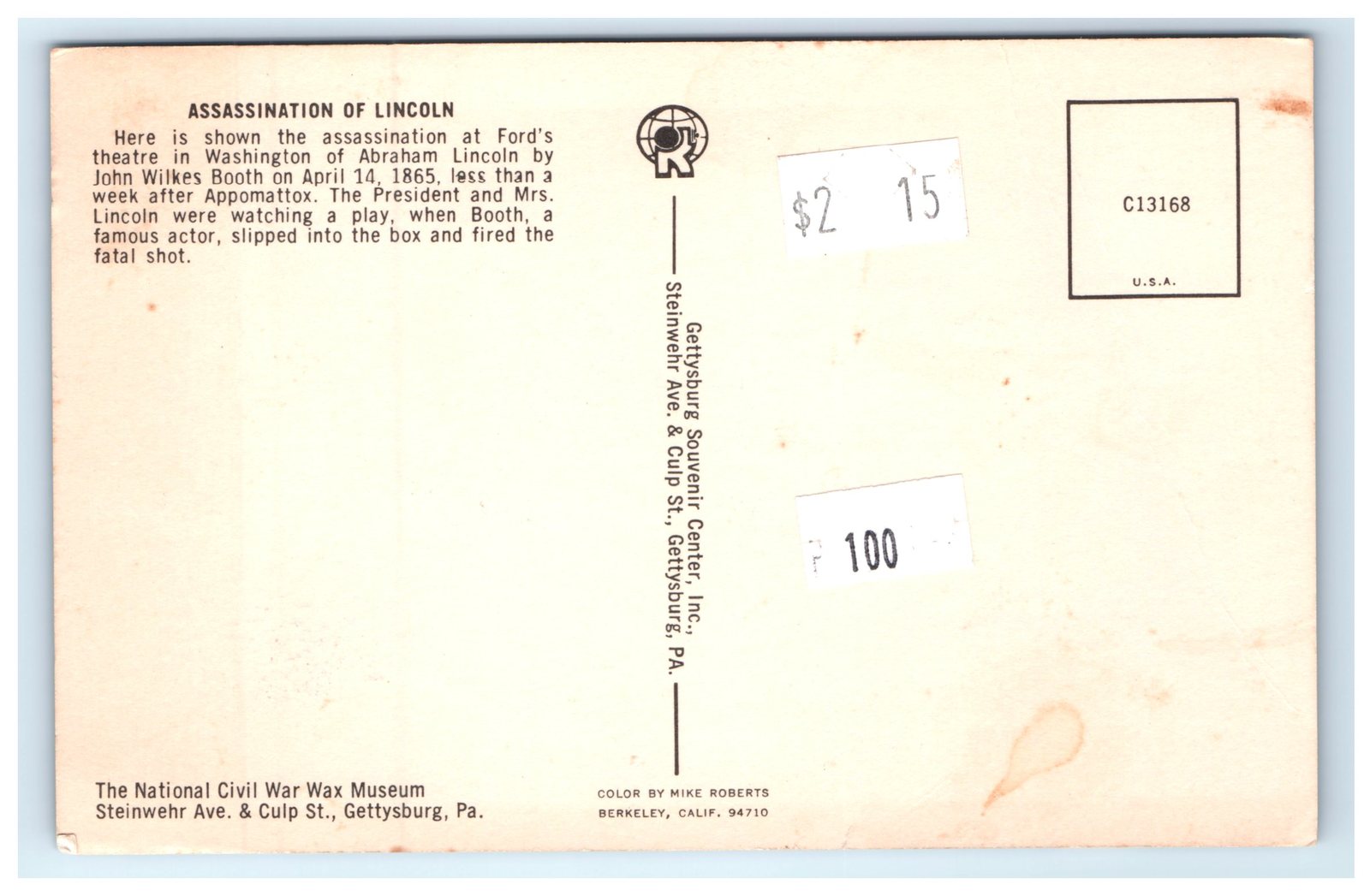 Published by the Gettysburg Souvenir Center, Inc. of Gettysburg, Pennsylvania, this lithographed card features color by Mike Roberts of Berkeley, California. It is an original printed chrome postcard measuring the standard 5.5 x 3.5 inches, and it comes unposted. The card promotes The National Civil War Wax Museum, located at Steinwehr Avenue Culp Street in Gettysburg, a renowned destination for Civil War enthusiasts and collectors. This collectible postcard offers both historical and educational appeal, ideal for collectors of American history, presidential memorabilia, or vintage postcards.