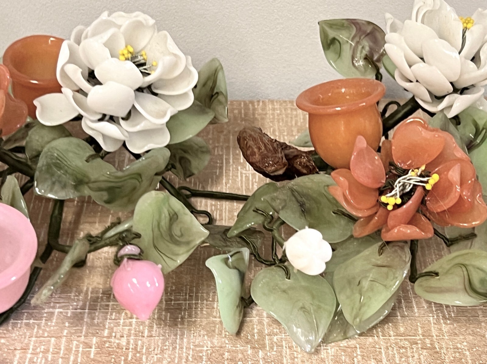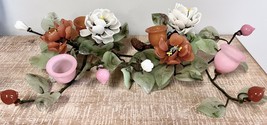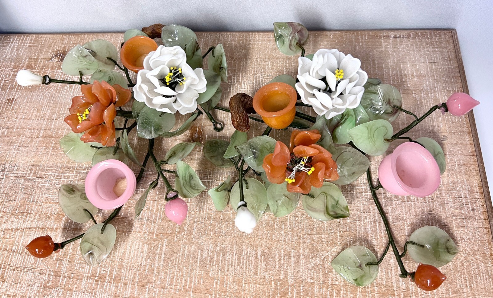 The colors are soft coral, green, white and pink, and there are small candle holders on.