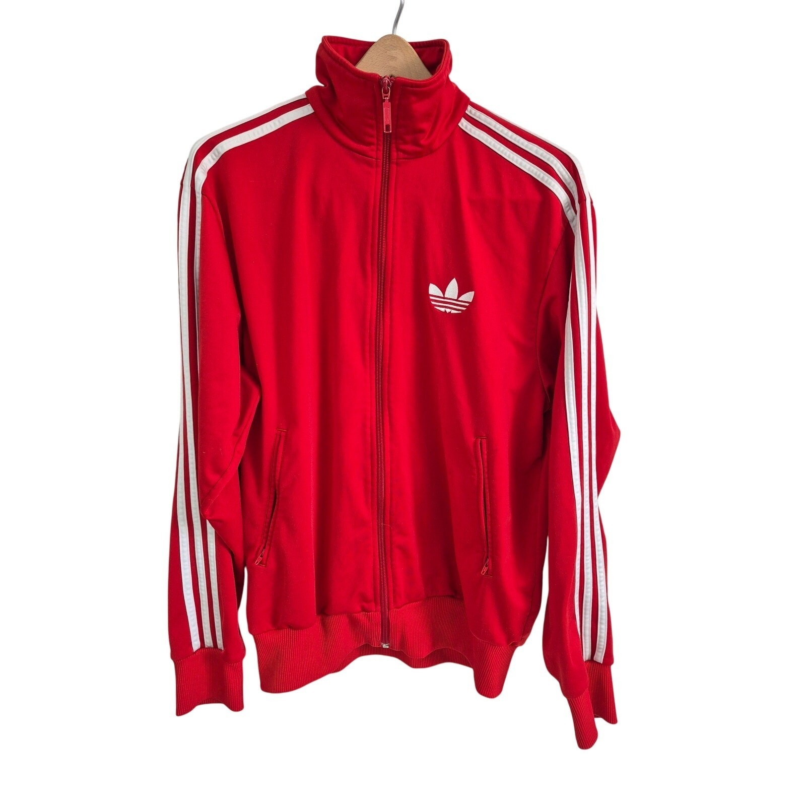 ADIDAS Men's Track Jacket BIG TREFOIL Embroidered Red 2009 Zip Top Size M EUC! 3 White Stripes- This popular style from 2009 has the big trefoil embroidered at the chest. Great color and classic style all the way! It has a full zip and two zipped pockets. It is well made.